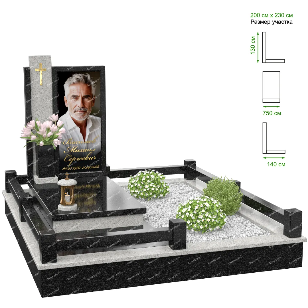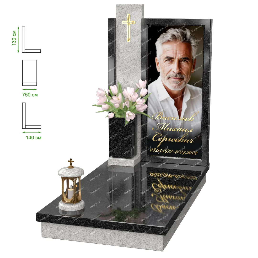 Визуально комплекс отличается от типовой формы не только формой, но и размерами. Массивная стела позволяет дизайнеру реализовать практически любые задумки и пожелания Заказчика, придать готовому изделию солидный вид, раскрыть все достоинства использованного в его изготовлении гранита. Такой габаритный памятник требует профессиональной доставки и установки. Все это также можно заказать в мастерской Грин-Стоун.