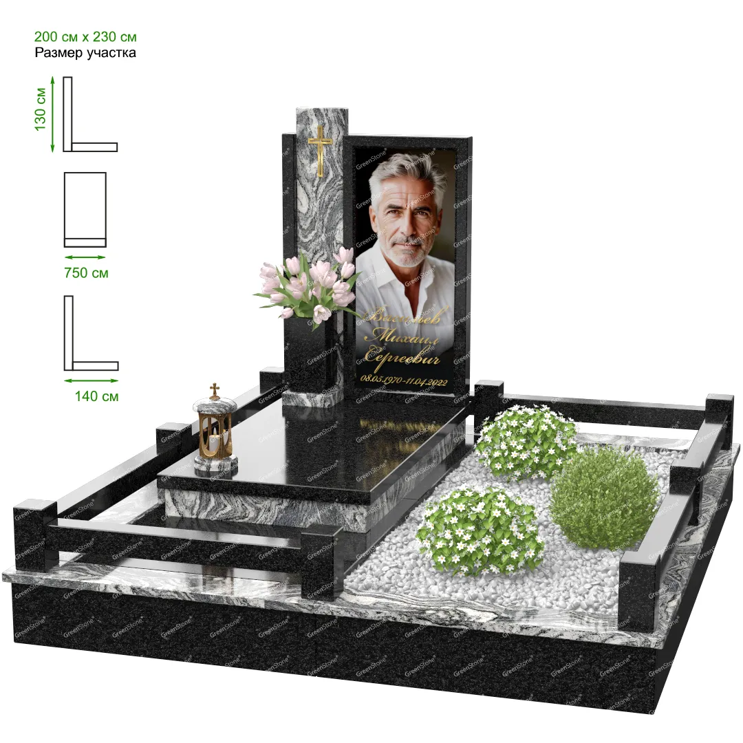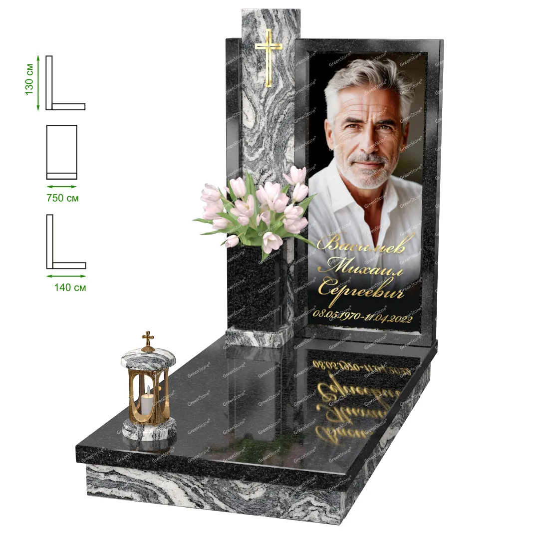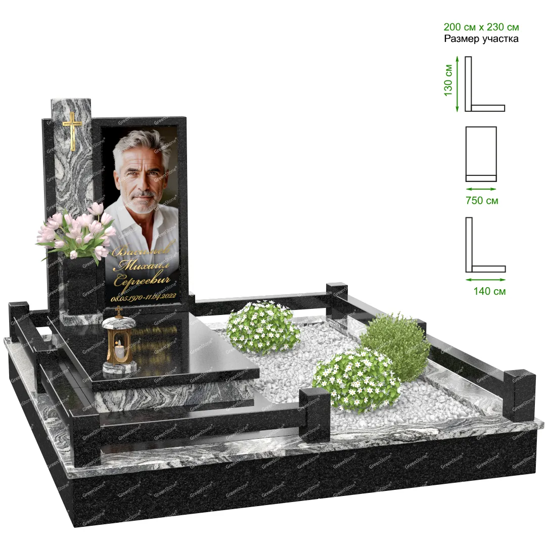 Визуально комплекс отличается от типовой формы не только формой, но и размерами. Массивная стела позволяет дизайнеру реализовать практически любые задумки и пожелания Заказчика, придать готовому изделию солидный вид, раскрыть все достоинства использованного в его изготовлении гранита. Такой габаритный памятник требует профессиональной доставки и установки. Все это также можно заказать в мастерской Грин-Стоун.