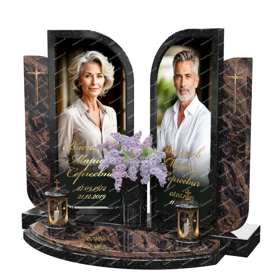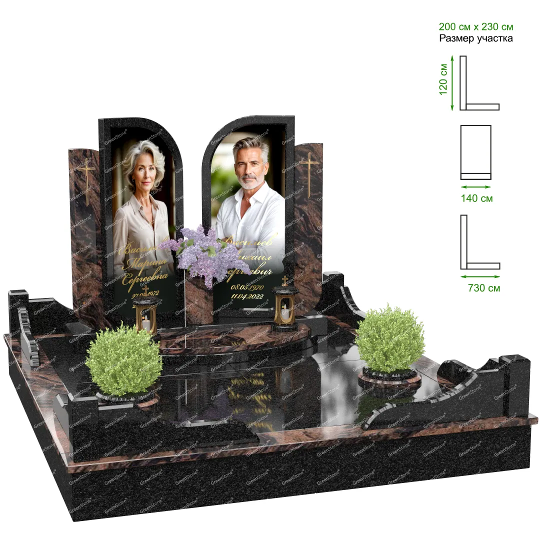 Визуально комплекс отличается от типовой формы не только формой, но и размерами. Массивная стела позволяет дизайнеру реализовать практически любые задумки и пожелания Заказчика, придать готовому изделию солидный вид, раскрыть все достоинства использованного в его изготовлении гранита. Такой габаритный памятник требует профессиональной доставки и установки. Все это также можно заказать в мастерской Грин-Стоун.