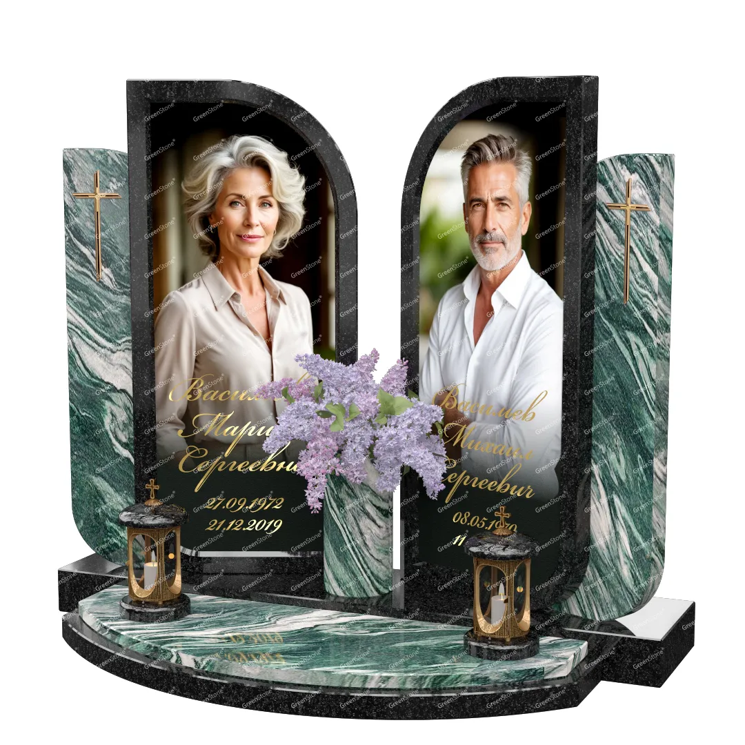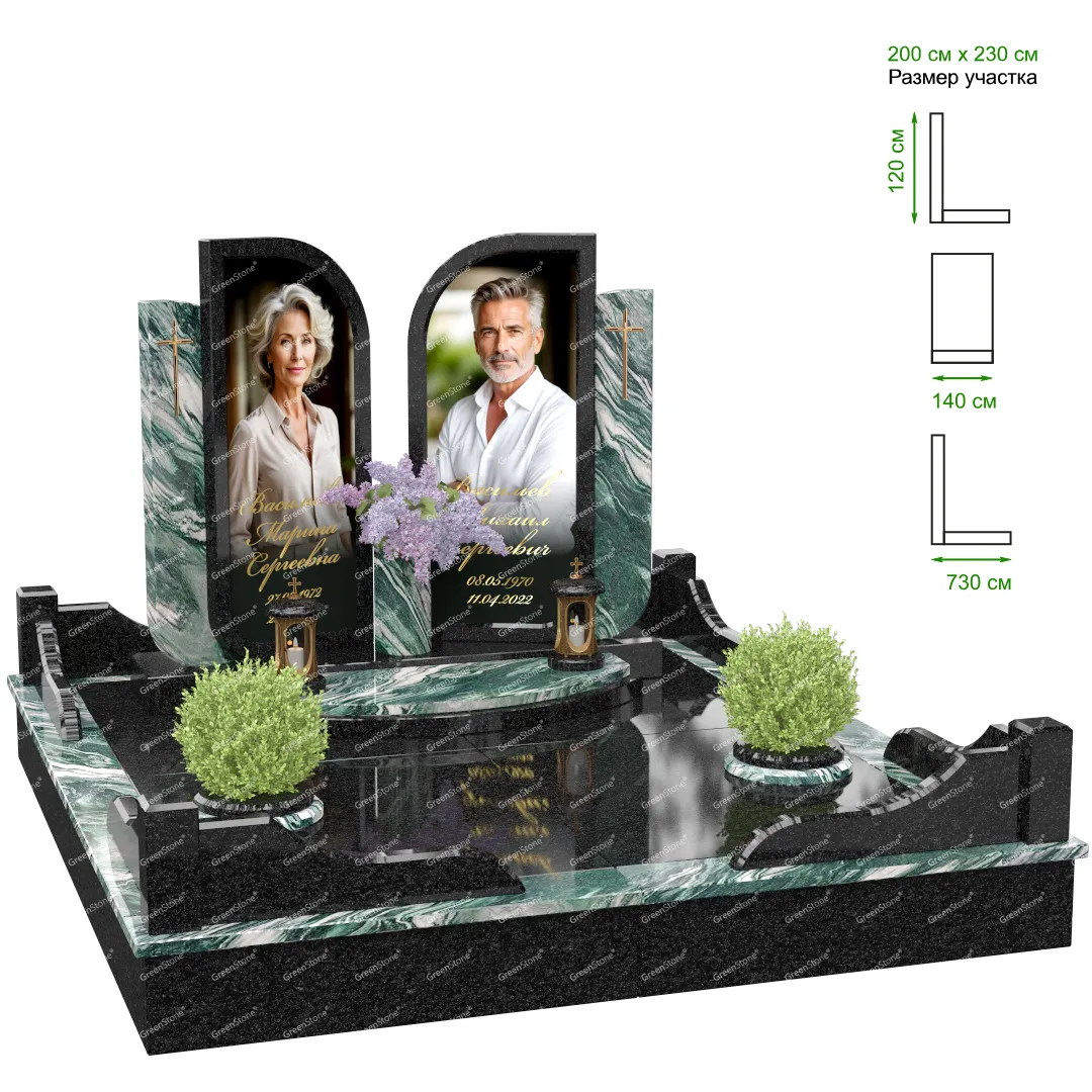 Визуально комплекс отличается от типовой формы не только формой, но и размерами. Массивная стела позволяет дизайнеру реализовать практически любые задумки и пожелания Заказчика, придать готовому изделию солидный вид, раскрыть все достоинства использованного в его изготовлении гранита. Такой габаритный памятник требует профессиональной доставки и установки. Все это также можно заказать в мастерской Грин-Стоун.