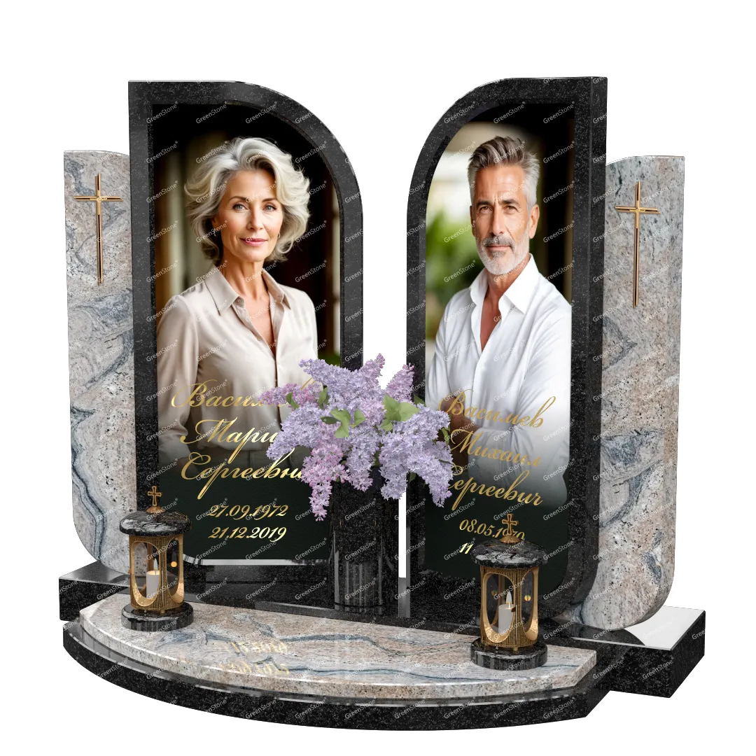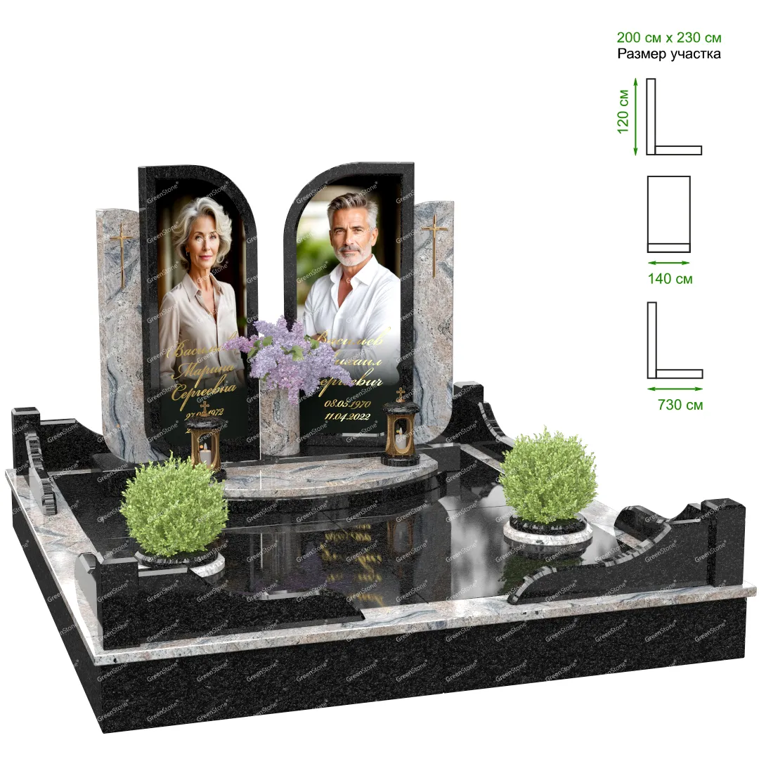 Визуально комплекс отличается от типовой формы не только формой, но и размерами. Массивная стела позволяет дизайнеру реализовать практически любые задумки и пожелания Заказчика, придать готовому изделию солидный вид, раскрыть все достоинства использованного в его изготовлении гранита. Такой габаритный памятник требует профессиональной доставки и установки. Все это также можно заказать в мастерской Грин-Стоун.