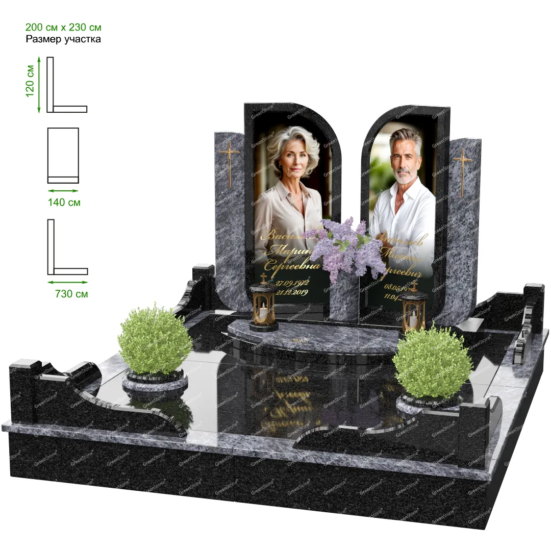 Визуально комплекс отличается от типовой формы не только формой, но и размерами. Массивная стела позволяет дизайнеру реализовать практически любые задумки и пожелания Заказчика, придать готовому изделию солидный вид, раскрыть все достоинства использованного в его изготовлении гранита. Такой габаритный памятник требует профессиональной доставки и установки. Все это также можно заказать в мастерской Грин-Стоун.