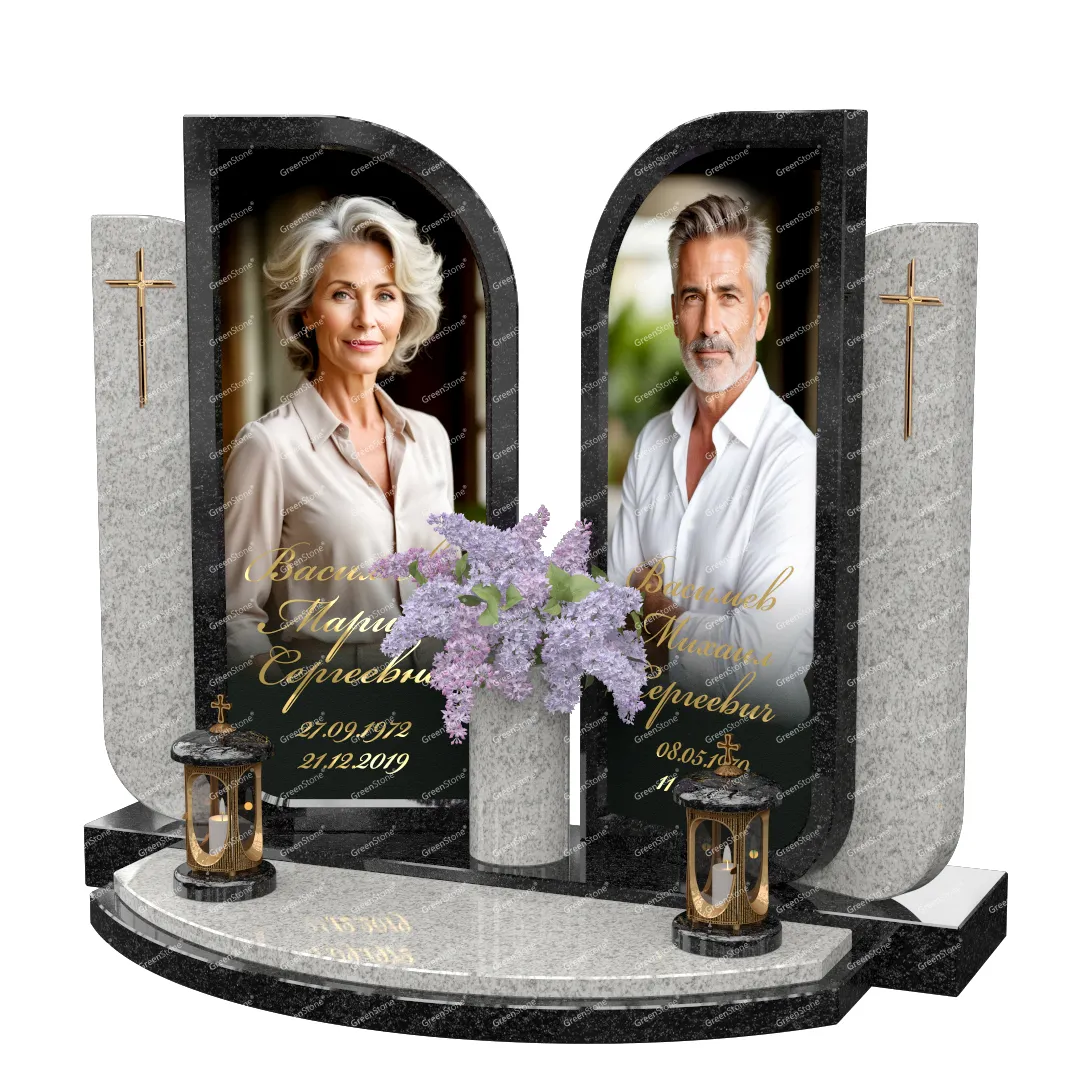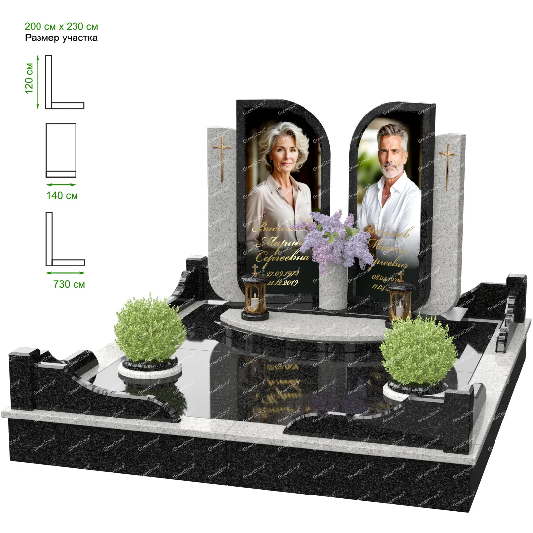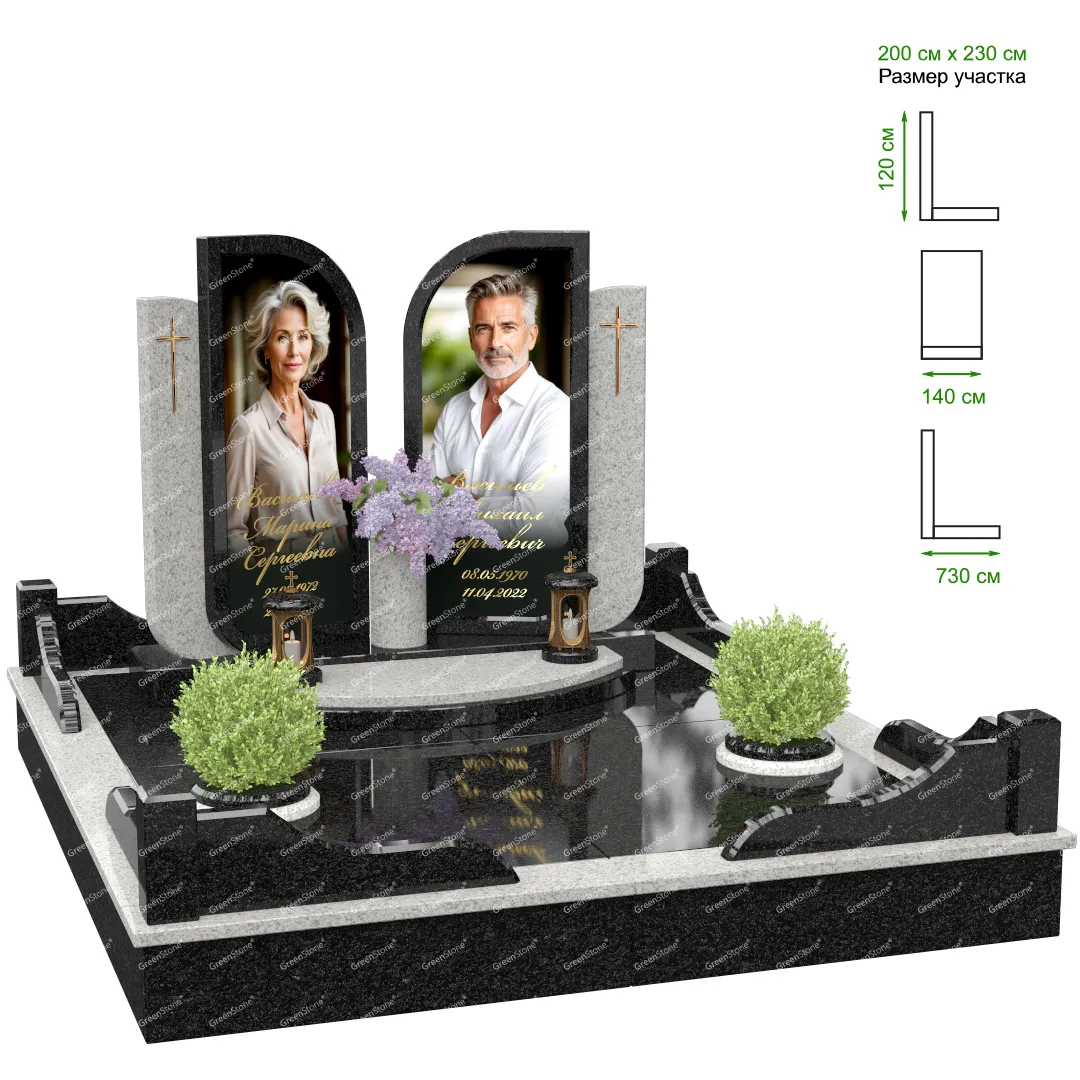 Визуально комплекс отличается от типовой формы не только формой, но и размерами. Массивная стела позволяет дизайнеру реализовать практически любые задумки и пожелания Заказчика, придать готовому изделию солидный вид, раскрыть все достоинства использованного в его изготовлении гранита. Такой габаритный памятник требует профессиональной доставки и установки. Все это также можно заказать в мастерской Грин-Стоун.