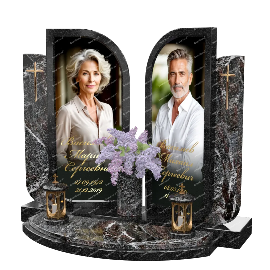 Визуально комплекс отличается от типовой формы не только формой, но и размерами. Массивная стела позволяет дизайнеру реализовать практически любые задумки и пожелания Заказчика, придать готовому изделию солидный вид, раскрыть все достоинства использованного в его изготовлении гранита. Такой габаритный памятник требует профессиональной доставки и установки. Все это также можно заказать в мастерской Грин-Стоун.
