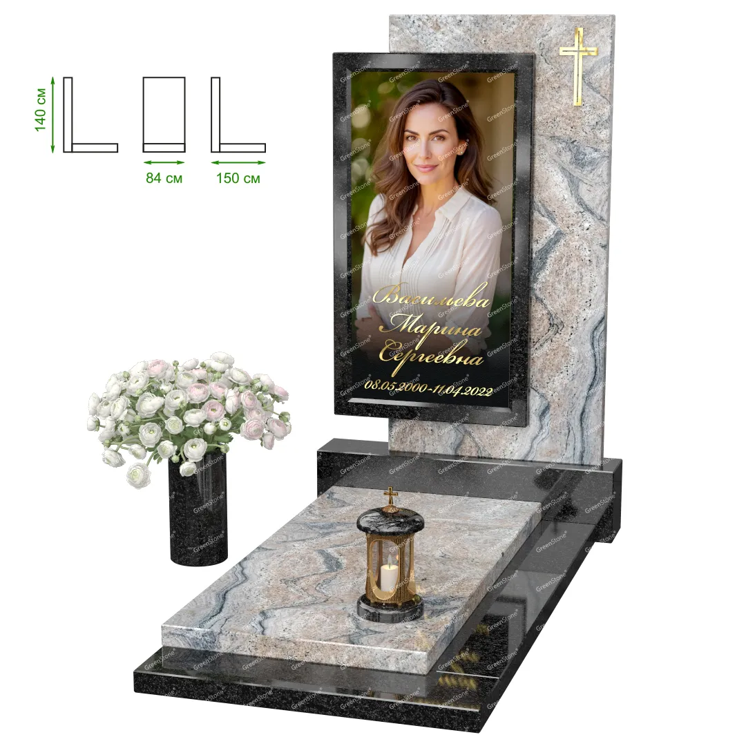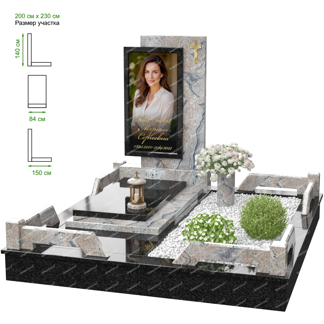 Визуально комплекс отличается от типовой формы не только формой, но и размерами. Массивная стела позволяет дизайнеру реализовать практически любые задумки и пожелания Заказчика, придать готовому изделию солидный вид, раскрыть все достоинства использованного в его изготовлении гранита. Такой габаритный памятник требует профессиональной доставки и установки. Все это также можно заказать в мастерской Грин-Стоун.