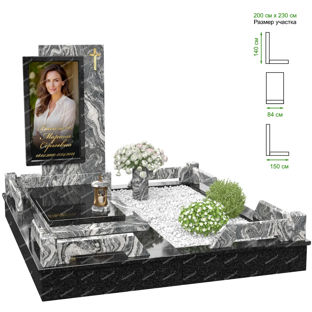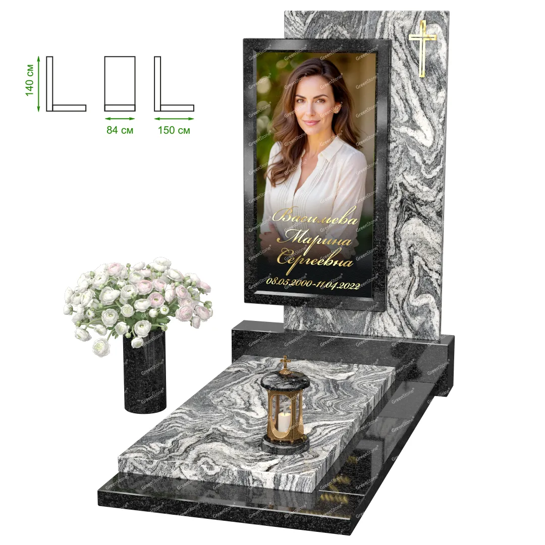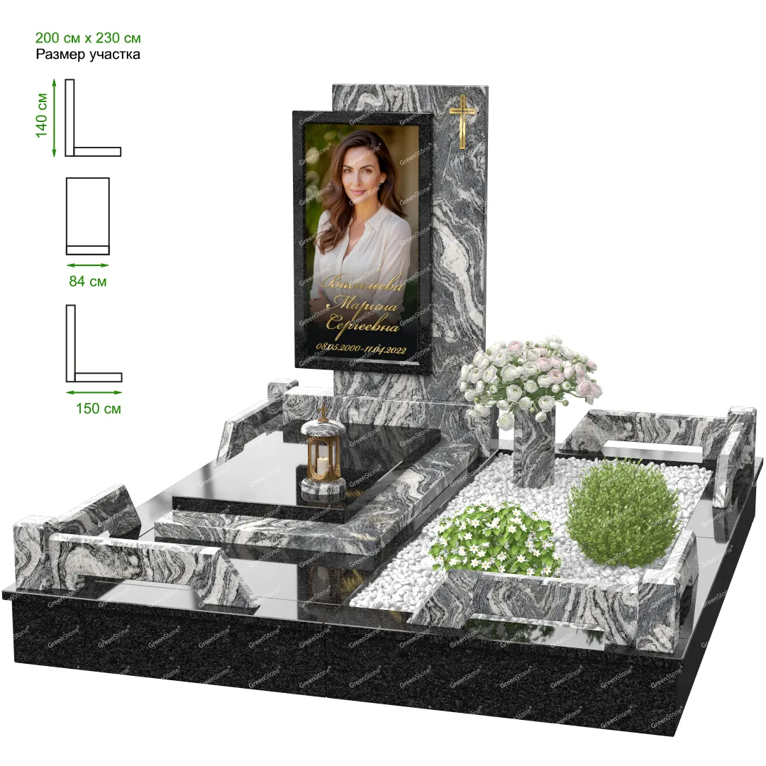 Визуально комплекс отличается от типовой формы не только формой, но и размерами. Массивная стела позволяет дизайнеру реализовать практически любые задумки и пожелания Заказчика, придать готовому изделию солидный вид, раскрыть все достоинства использованного в его изготовлении гранита. Такой габаритный памятник требует профессиональной доставки и установки. Все это также можно заказать в мастерской Грин-Стоун.