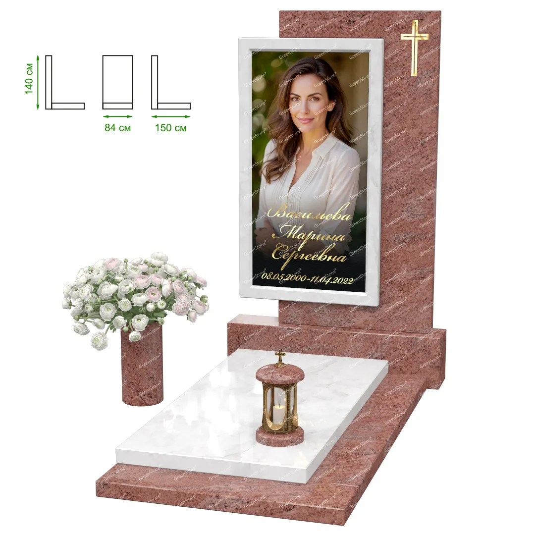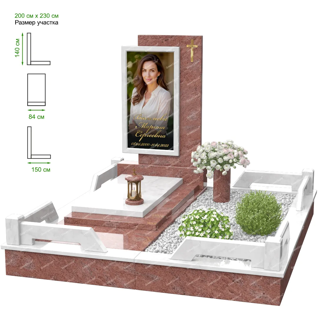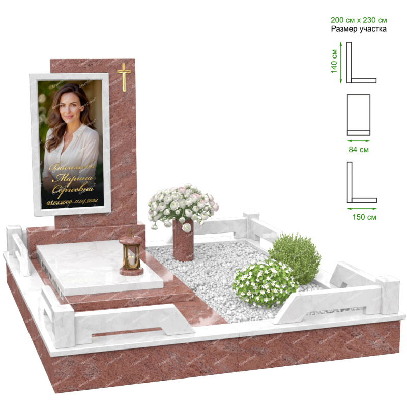 Визуально комплекс отличается от типовой формы не только формой, но и размерами. Массивная стела позволяет дизайнеру реализовать практически любые задумки и пожелания Заказчика, придать готовому изделию солидный вид, раскрыть все достоинства использованного в его изготовлении гранита. Такой габаритный памятник требует профессиональной доставки и установки. Все это также можно заказать в мастерской Грин-Стоун.