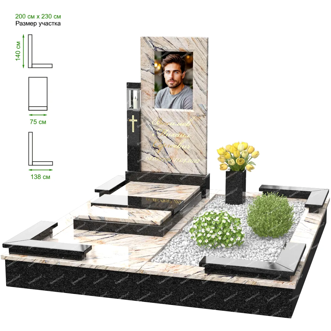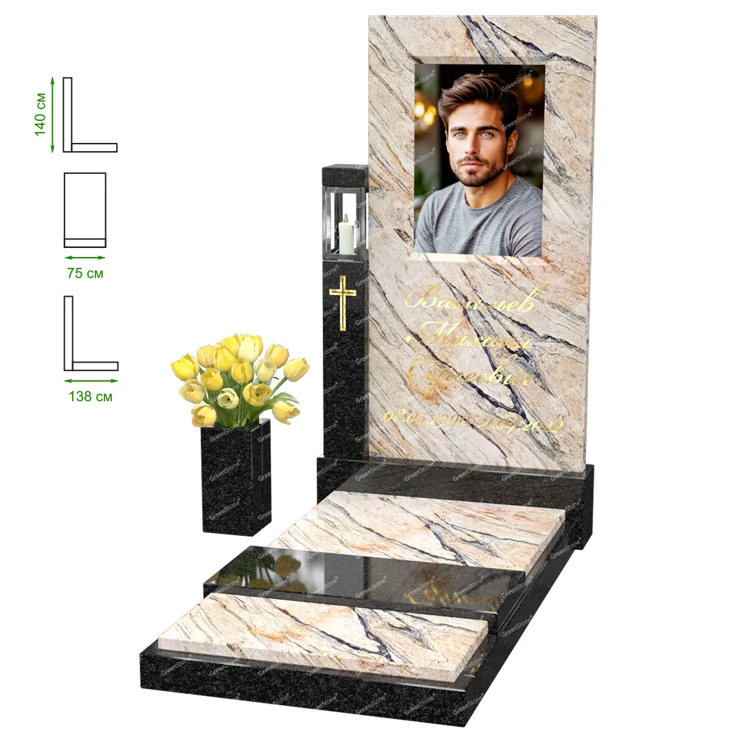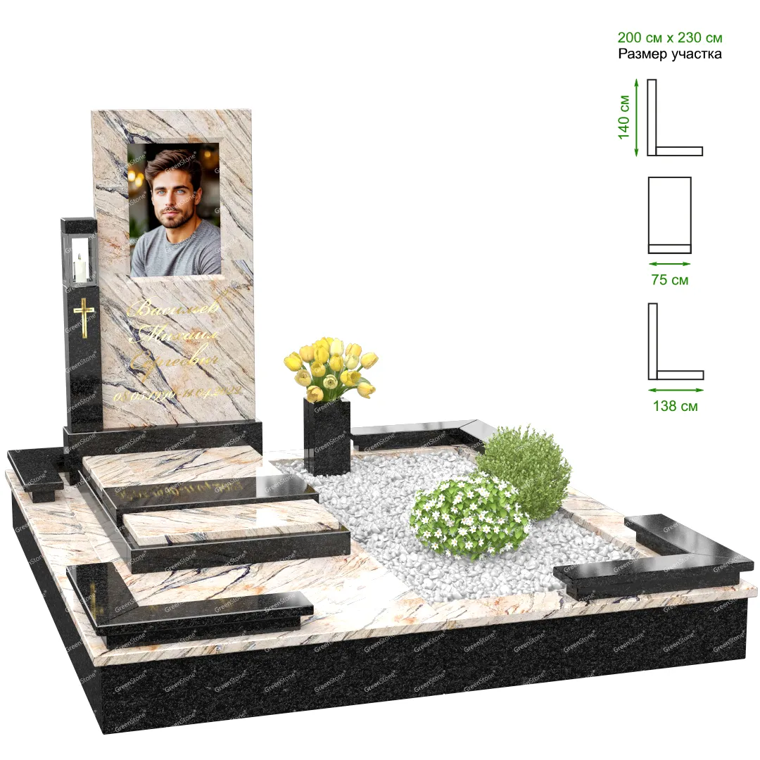 Визуально комплекс отличается от типовой формы не только формой, но и размерами. Массивная стела позволяет дизайнеру реализовать практически любые задумки и пожелания Заказчика, придать готовому изделию солидный вид, раскрыть все достоинства использованного в его изготовлении гранита. Такой габаритный памятник требует профессиональной доставки и установки. Все это также можно заказать в мастерской Грин-Стоун.