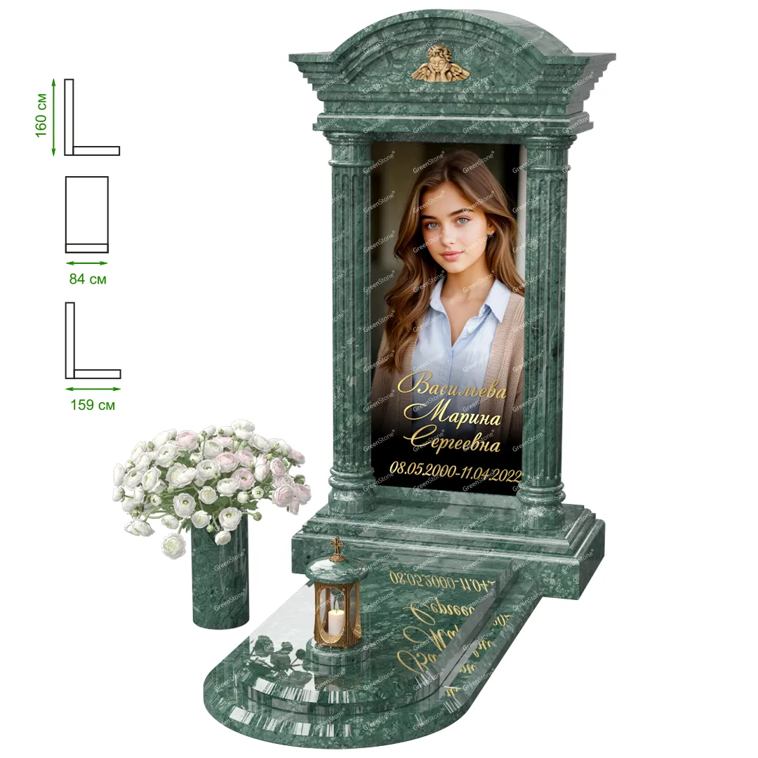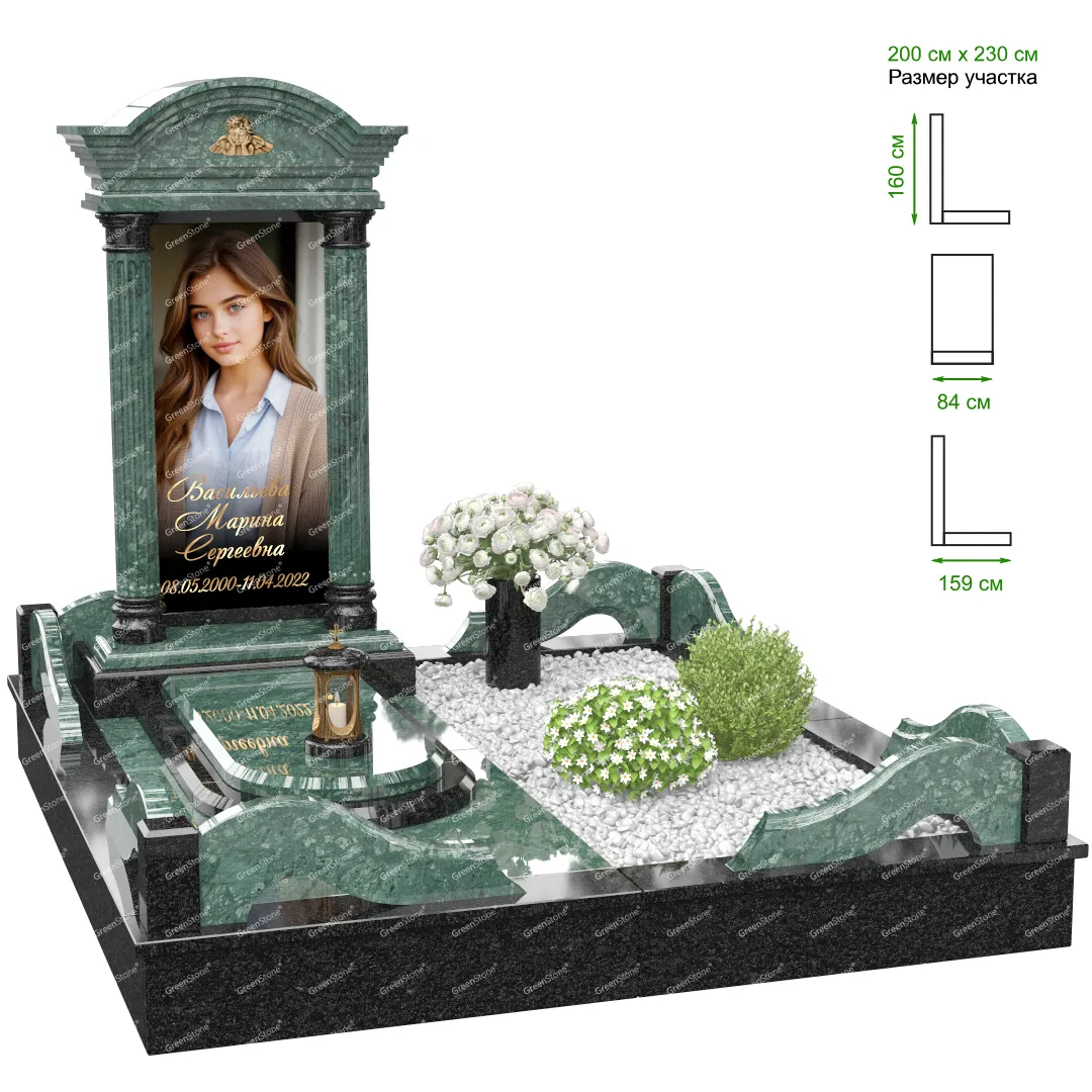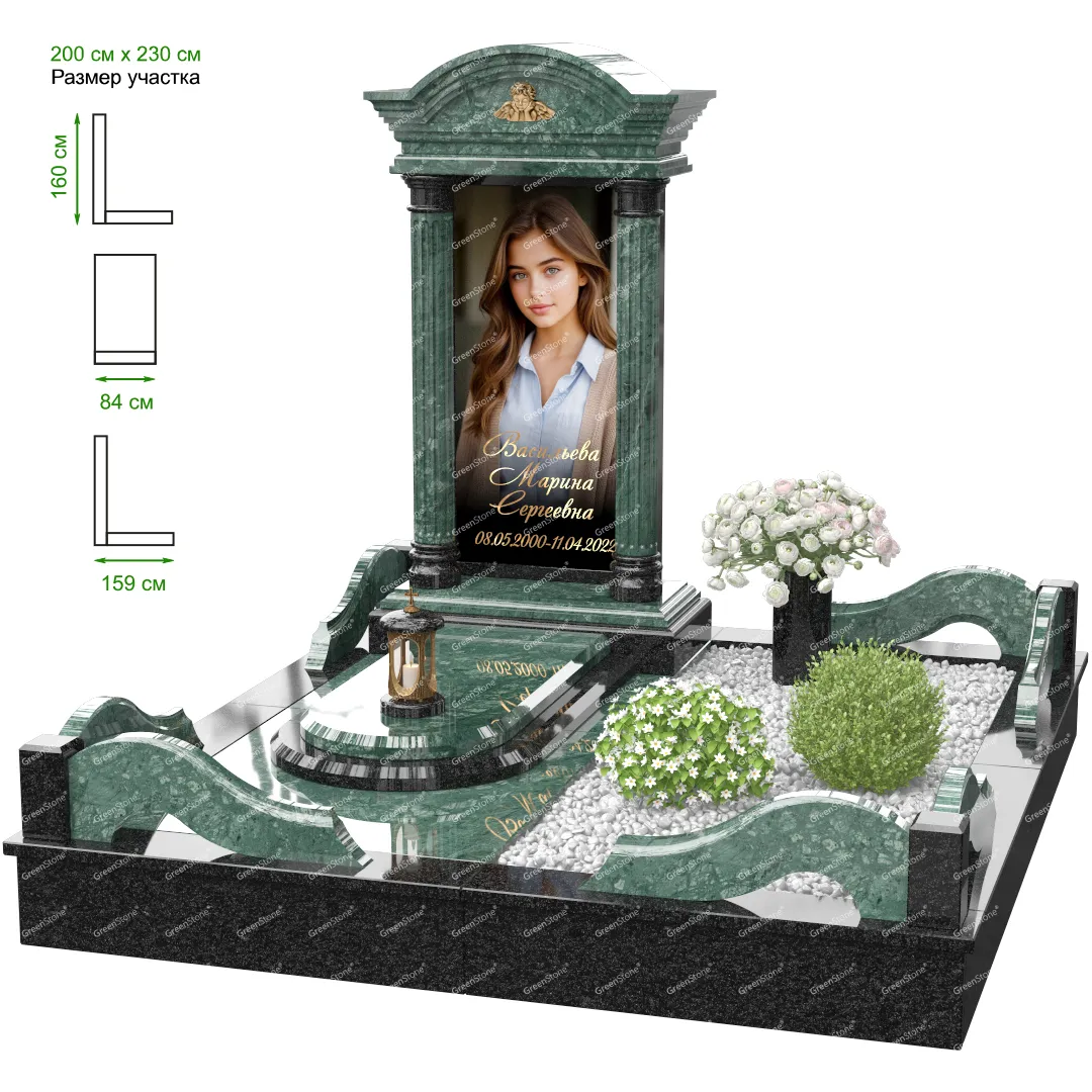 Визуально комплекс отличается от типовой формы не только формой, но и размерами. Массивная стела позволяет дизайнеру реализовать практически любые задумки и пожелания Заказчика, придать готовому изделию солидный вид, раскрыть все достоинства использованного в его изготовлении гранита. Такой габаритный памятник требует профессиональной доставки и установки. Все это также можно заказать в мастерской Грин-Стоун.