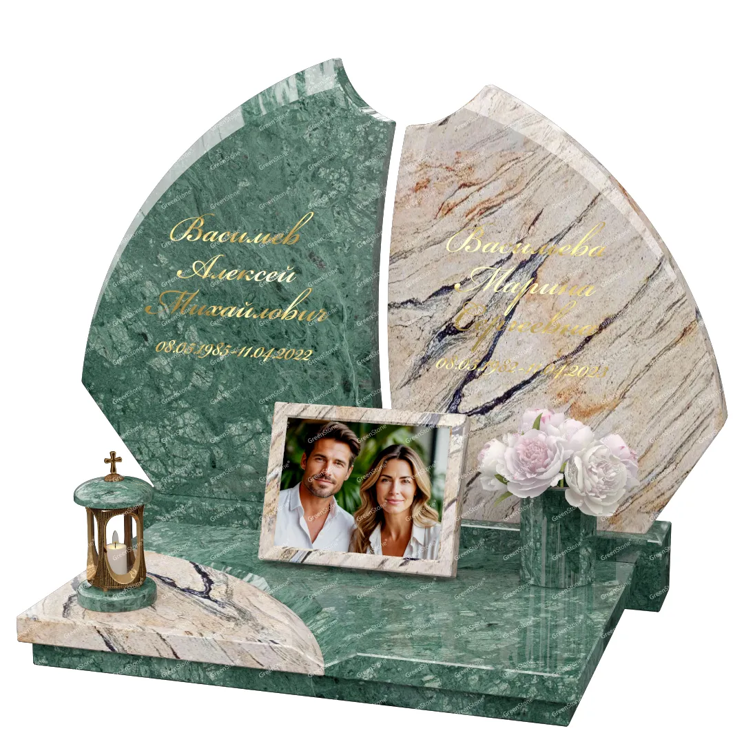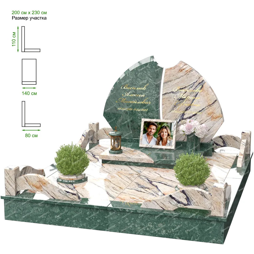Визуально комплекс отличается от типовой формы не только формой, но и размерами. Массивная стела позволяет дизайнеру реализовать практически любые задумки и пожелания Заказчика, придать готовому изделию солидный вид, раскрыть все достоинства использованного в его изготовлении гранита. Такой габаритный памятник требует профессиональной доставки и установки. Все это также можно заказать в мастерской Грин-Стоун.