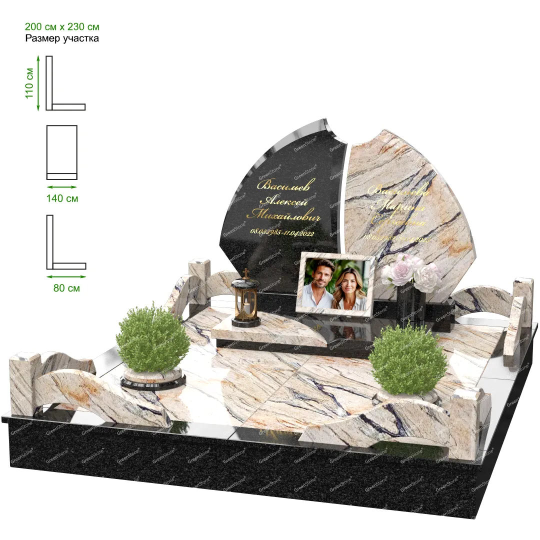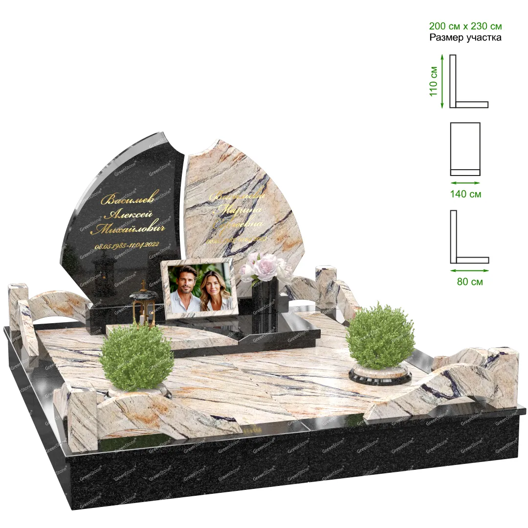 Визуально комплекс отличается от типовой формы не только формой, но и размерами. Массивная стела позволяет дизайнеру реализовать практически любые задумки и пожелания Заказчика, придать готовому изделию солидный вид, раскрыть все достоинства использованного в его изготовлении гранита. Такой габаритный памятник требует профессиональной доставки и установки. Все это также можно заказать в мастерской Грин-Стоун.