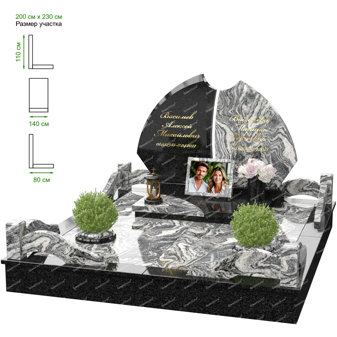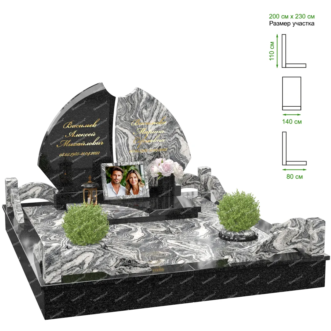 Визуально комплекс отличается от типовой формы не только формой, но и размерами. Массивная стела позволяет дизайнеру реализовать практически любые задумки и пожелания Заказчика, придать готовому изделию солидный вид, раскрыть все достоинства использованного в его изготовлении гранита. Такой габаритный памятник требует профессиональной доставки и установки. Все это также можно заказать в мастерской Грин-Стоун.