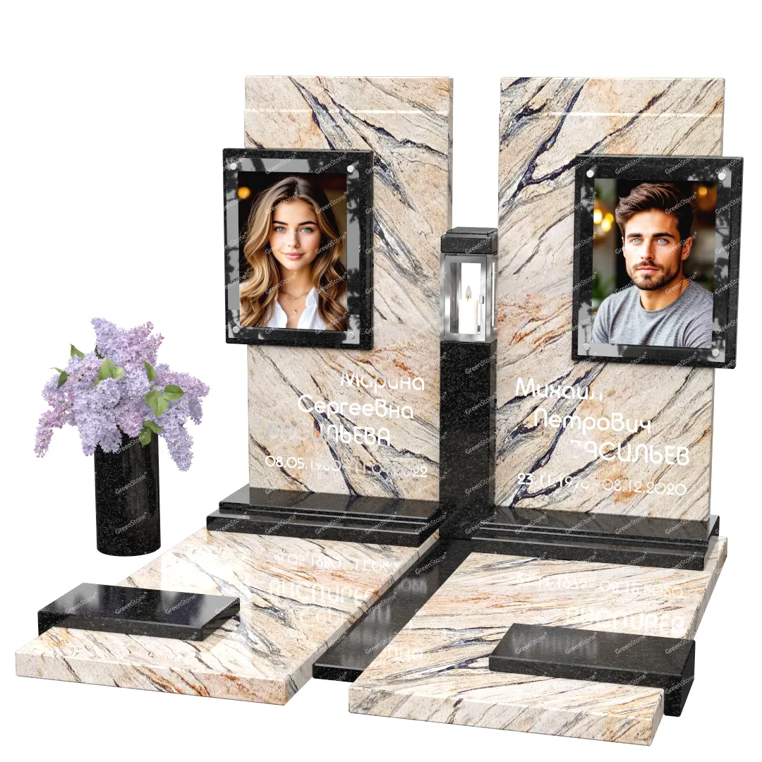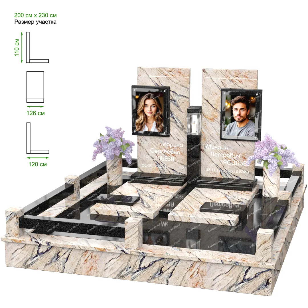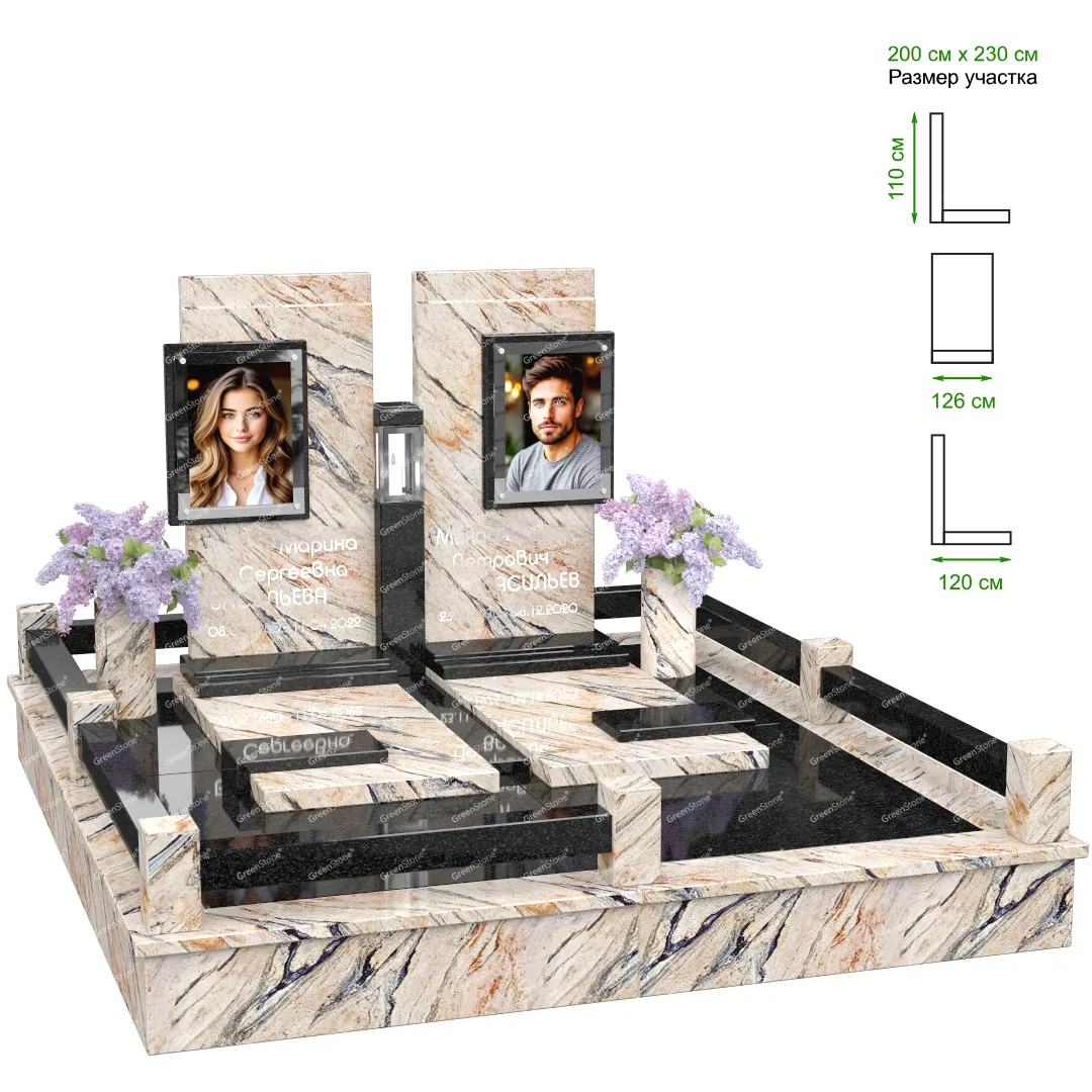 Визуально комплекс отличается от типовой формы не только формой, но и размерами. Массивная стела позволяет дизайнеру реализовать практически любые задумки и пожелания Заказчика, придать готовому изделию солидный вид, раскрыть все достоинства использованного в его изготовлении гранита. Такой габаритный памятник требует профессиональной доставки и установки. Все это также можно заказать в мастерской Грин-Стоун.