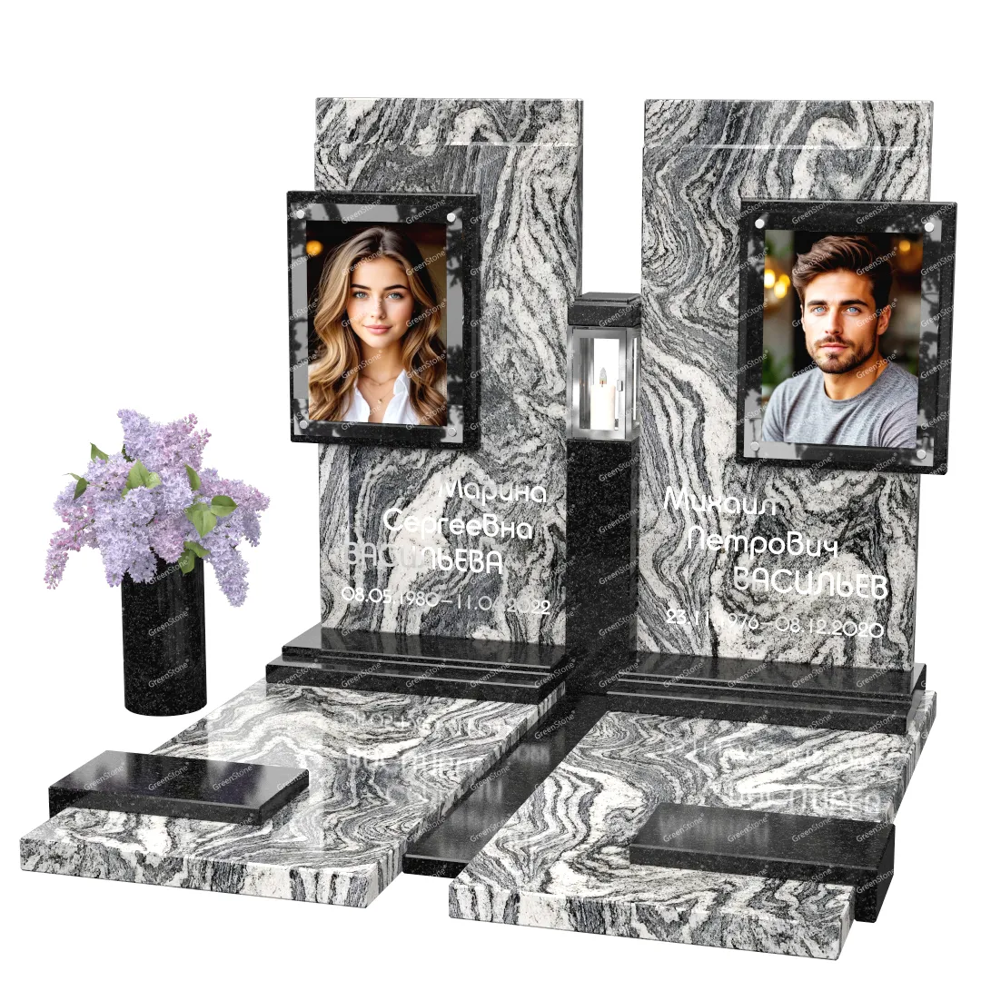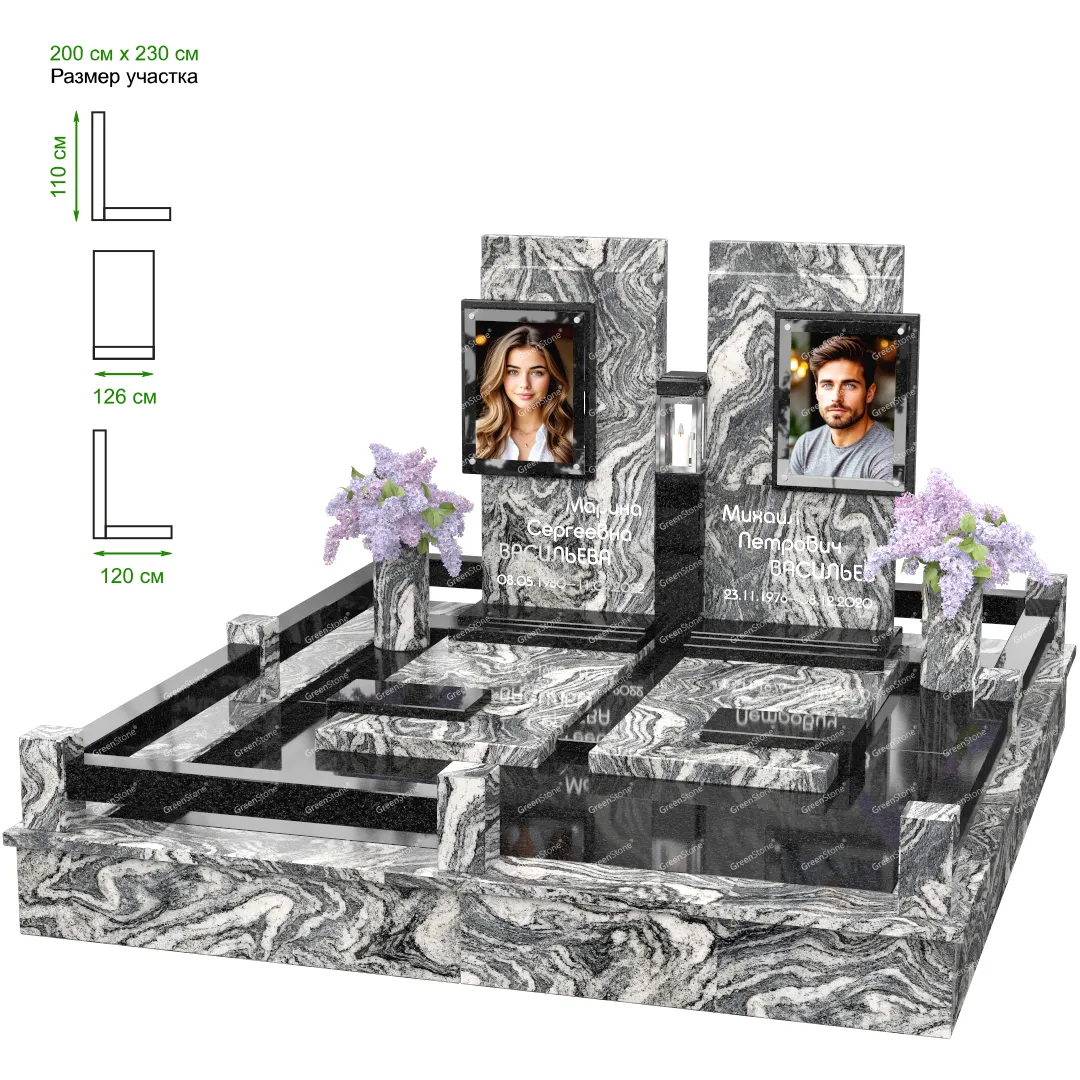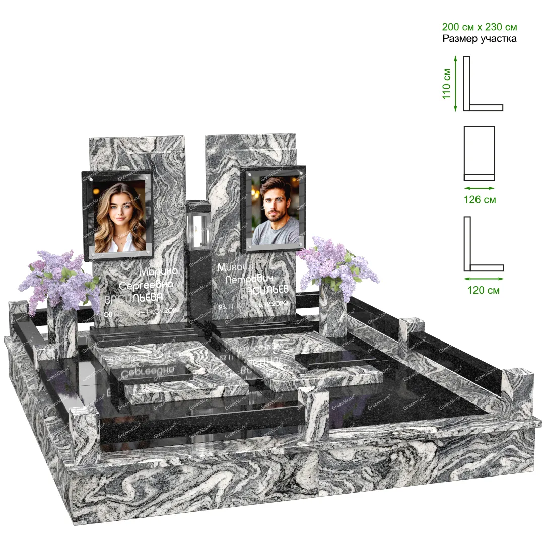 Визуально комплекс отличается от типовой формы не только формой, но и размерами. Массивная стела позволяет дизайнеру реализовать практически любые задумки и пожелания Заказчика, придать готовому изделию солидный вид, раскрыть все достоинства использованного в его изготовлении гранита. Такой габаритный памятник требует профессиональной доставки и установки. Все это также можно заказать в мастерской Грин-Стоун.