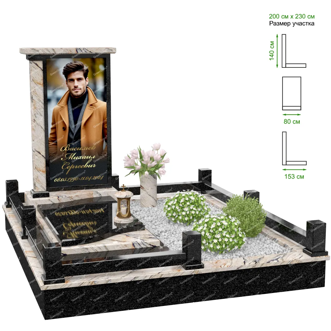 Визуально комплекс отличается от типовой формы не только формой, но и размерами. Массивная стела позволяет дизайнеру реализовать практически любые задумки и пожелания Заказчика, придать готовому изделию солидный вид, раскрыть все достоинства использованного в его изготовлении гранита. Такой габаритный памятник требует профессиональной доставки и установки. Все это также можно заказать в мастерской Грин-Стоун.