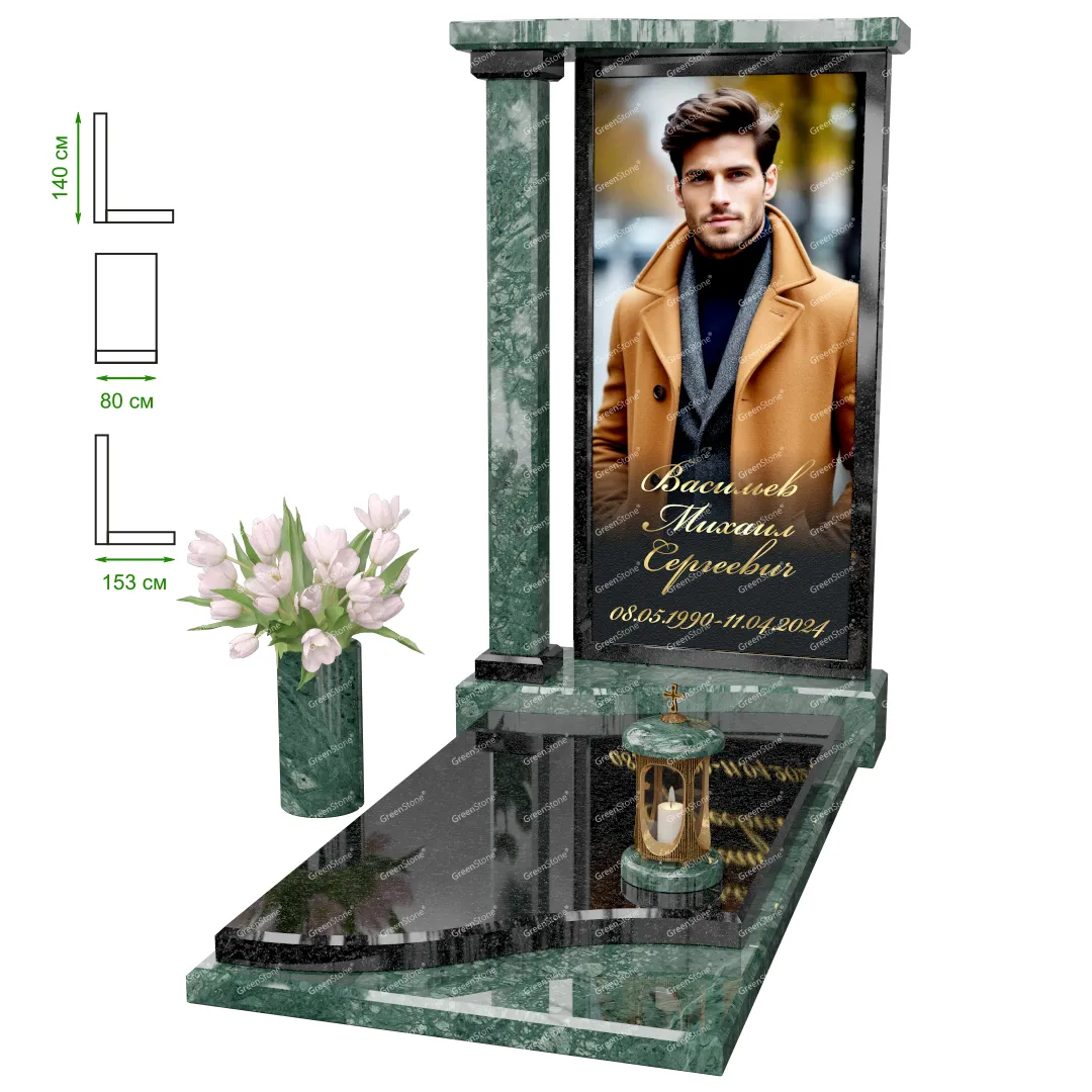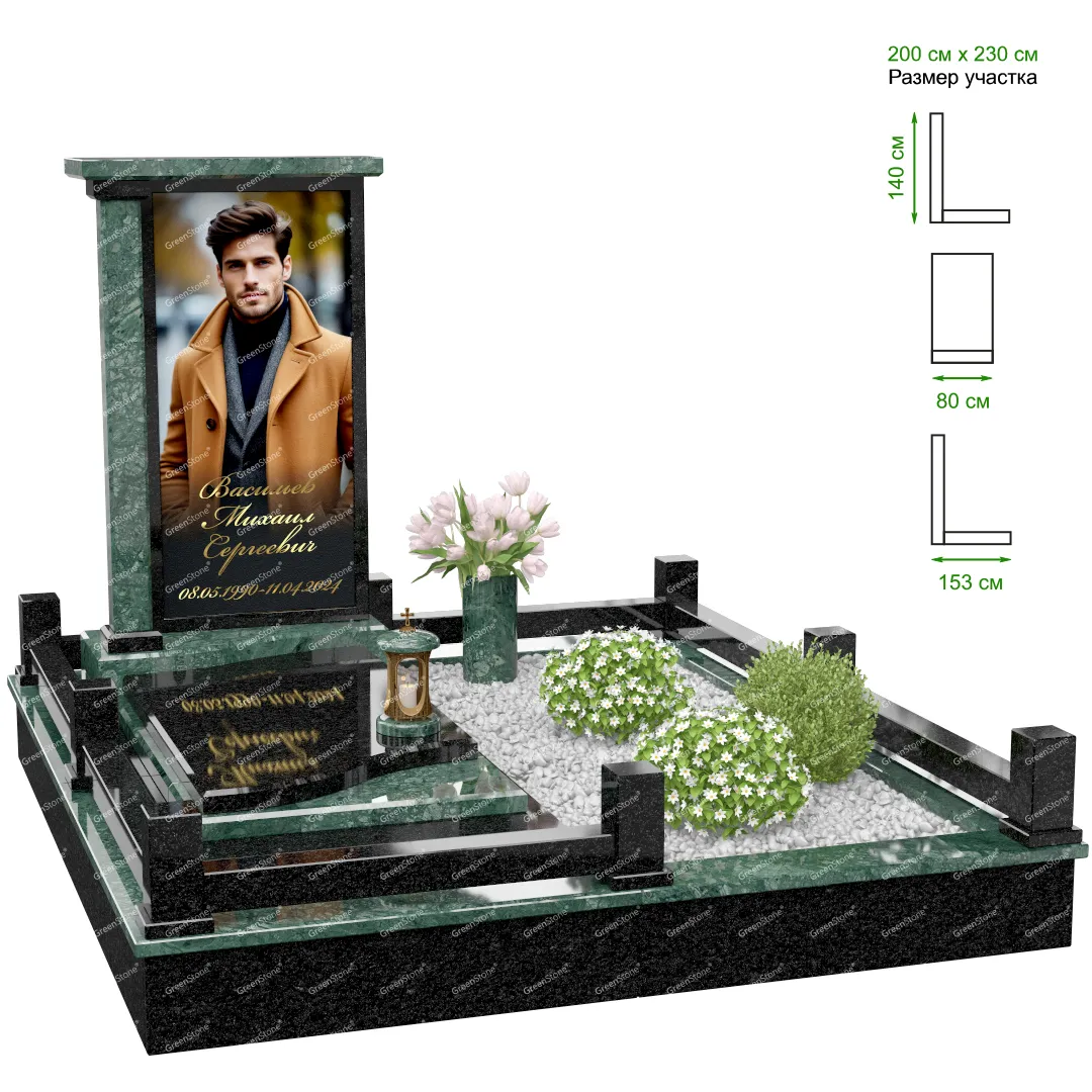 Визуально комплекс отличается от типовой формы не только формой, но и размерами. Массивная стела позволяет дизайнеру реализовать практически любые задумки и пожелания Заказчика, придать готовому изделию солидный вид, раскрыть все достоинства использованного в его изготовлении гранита. Такой габаритный памятник требует профессиональной доставки и установки. Все это также можно заказать в мастерской Грин-Стоун.