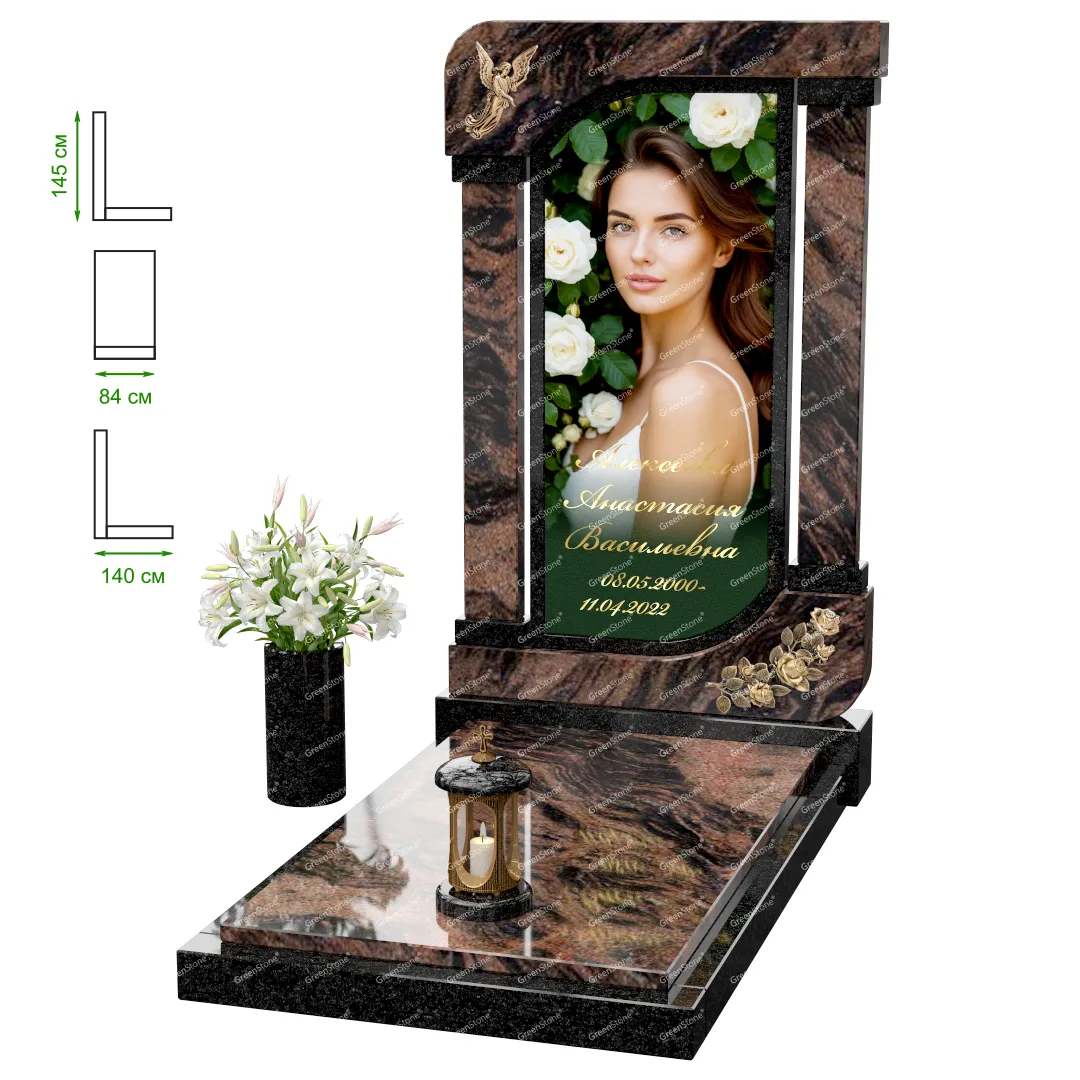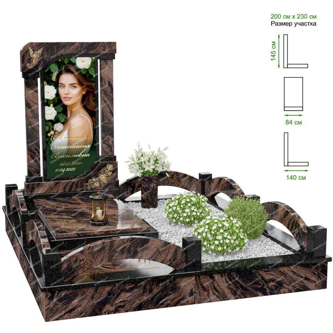 Визуально комплекс отличается от типовой формы не только формой, но и размерами. Массивная стела позволяет дизайнеру реализовать практически любые задумки и пожелания Заказчика, придать готовому изделию солидный вид, раскрыть все достоинства использованного в его изготовлении гранита. Такой габаритный памятник требует профессиональной доставки и установки. Все это также можно заказать в мастерской Грин-Стоун.