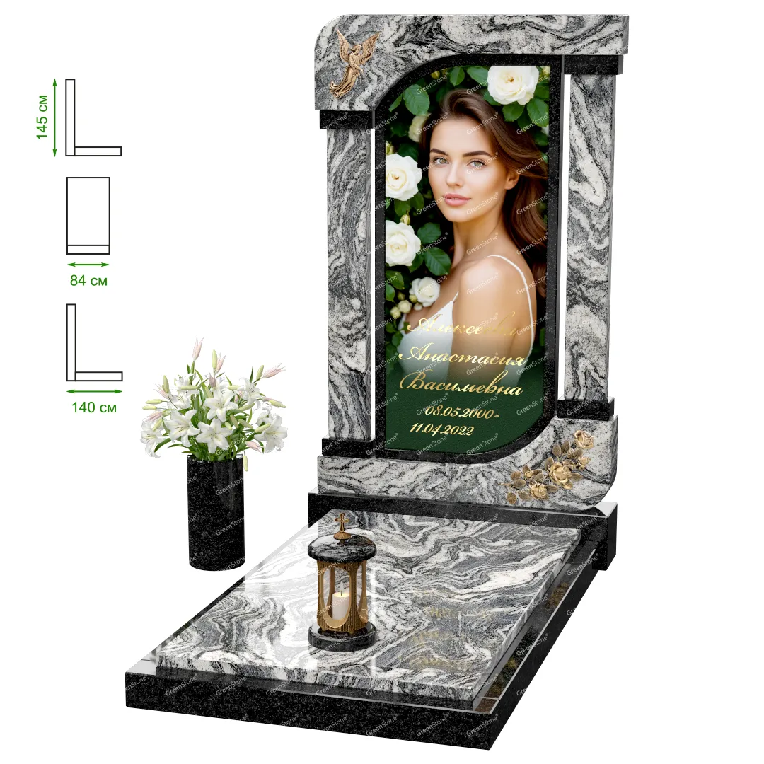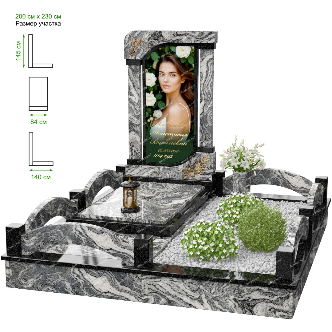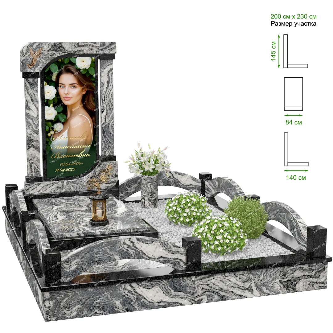 Визуально комплекс отличается от типовой формы не только формой, но и размерами. Массивная стела позволяет дизайнеру реализовать практически любые задумки и пожелания Заказчика, придать готовому изделию солидный вид, раскрыть все достоинства использованного в его изготовлении гранита. Такой габаритный памятник требует профессиональной доставки и установки. Все это также можно заказать в мастерской Грин-Стоун.