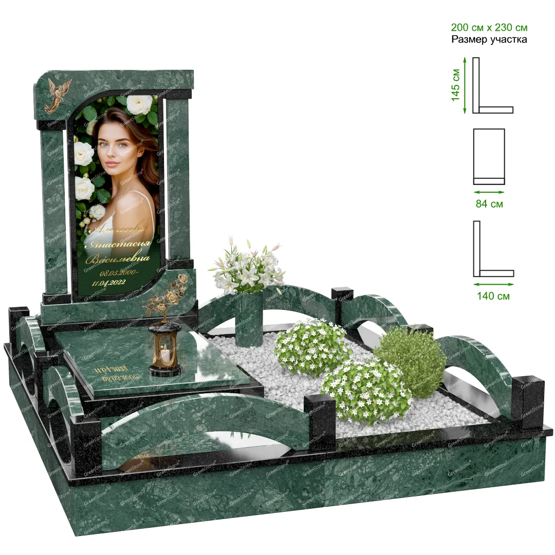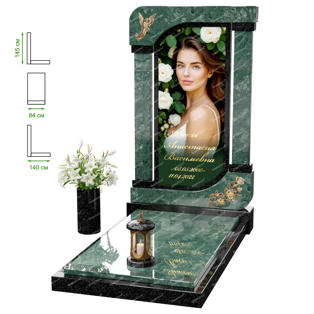 Визуально комплекс отличается от типовой формы не только формой, но и размерами. Массивная стела позволяет дизайнеру реализовать практически любые задумки и пожелания Заказчика, придать готовому изделию солидный вид, раскрыть все достоинства использованного в его изготовлении гранита. Такой габаритный памятник требует профессиональной доставки и установки. Все это также можно заказать в мастерской Грин-Стоун.