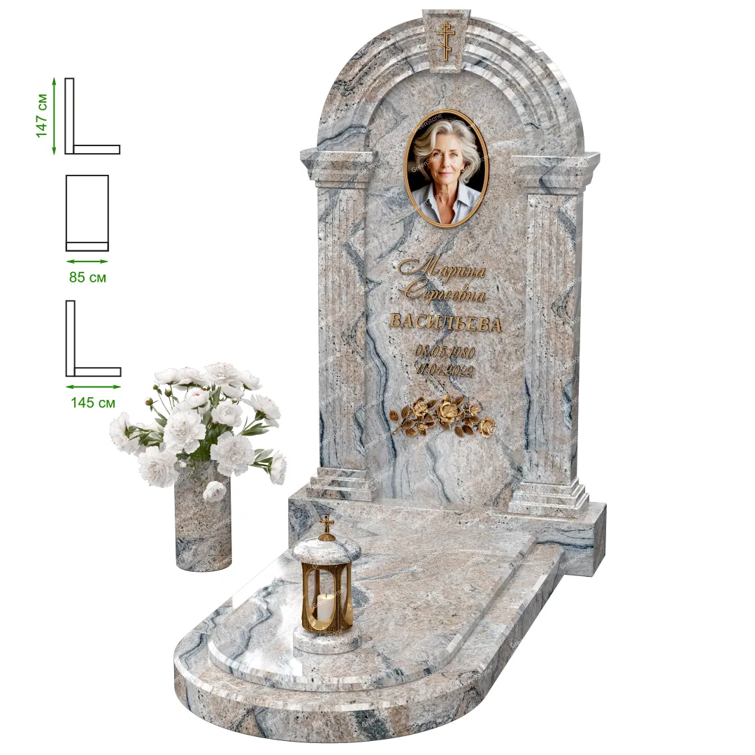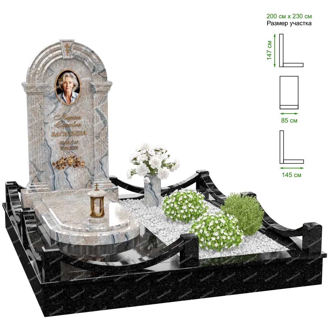 Визуально комплекс отличается от типовой формы не только формой, но и размерами. Массивная стела позволяет дизайнеру реализовать практически любые задумки и пожелания Заказчика, придать готовому изделию солидный вид, раскрыть все достоинства использованного в его изготовлении гранита. Такой габаритный памятник требует профессиональной доставки и установки. Все это также можно заказать в мастерской Грин-Стоун.