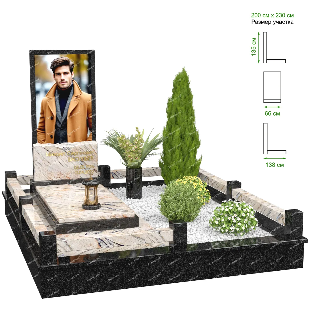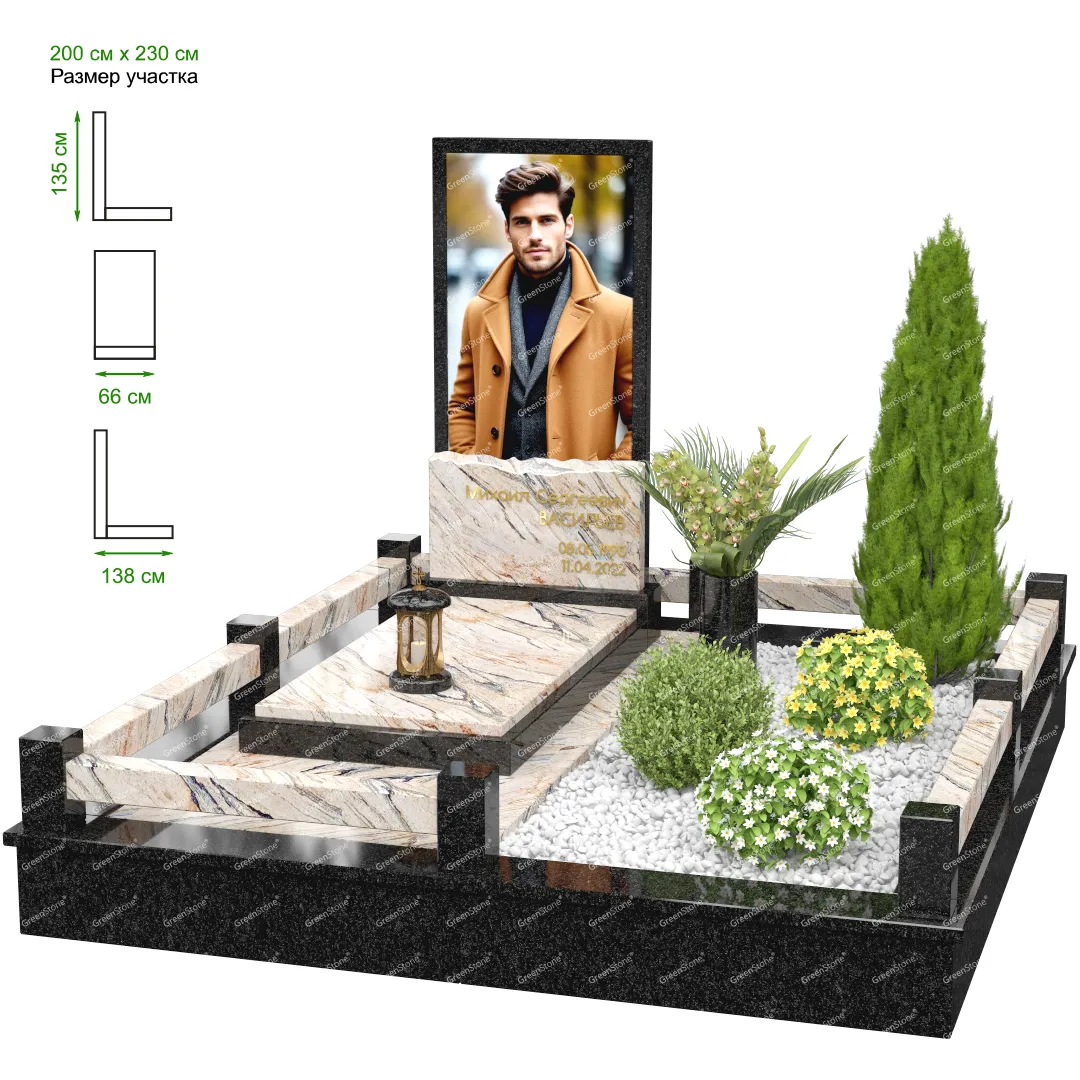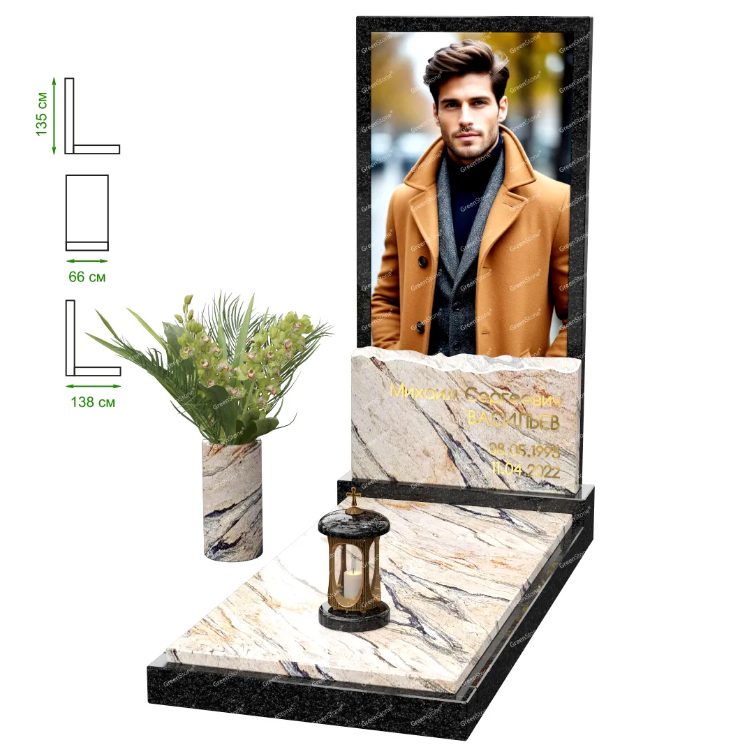 Визуально комплекс отличается от типовой формы не только формой, но и размерами. Массивная стела позволяет дизайнеру реализовать практически любые задумки и пожелания Заказчика, придать готовому изделию солидный вид, раскрыть все достоинства использованного в его изготовлении гранита. Такой габаритный памятник требует профессиональной доставки и установки. Все это также можно заказать в мастерской Грин-Стоун.