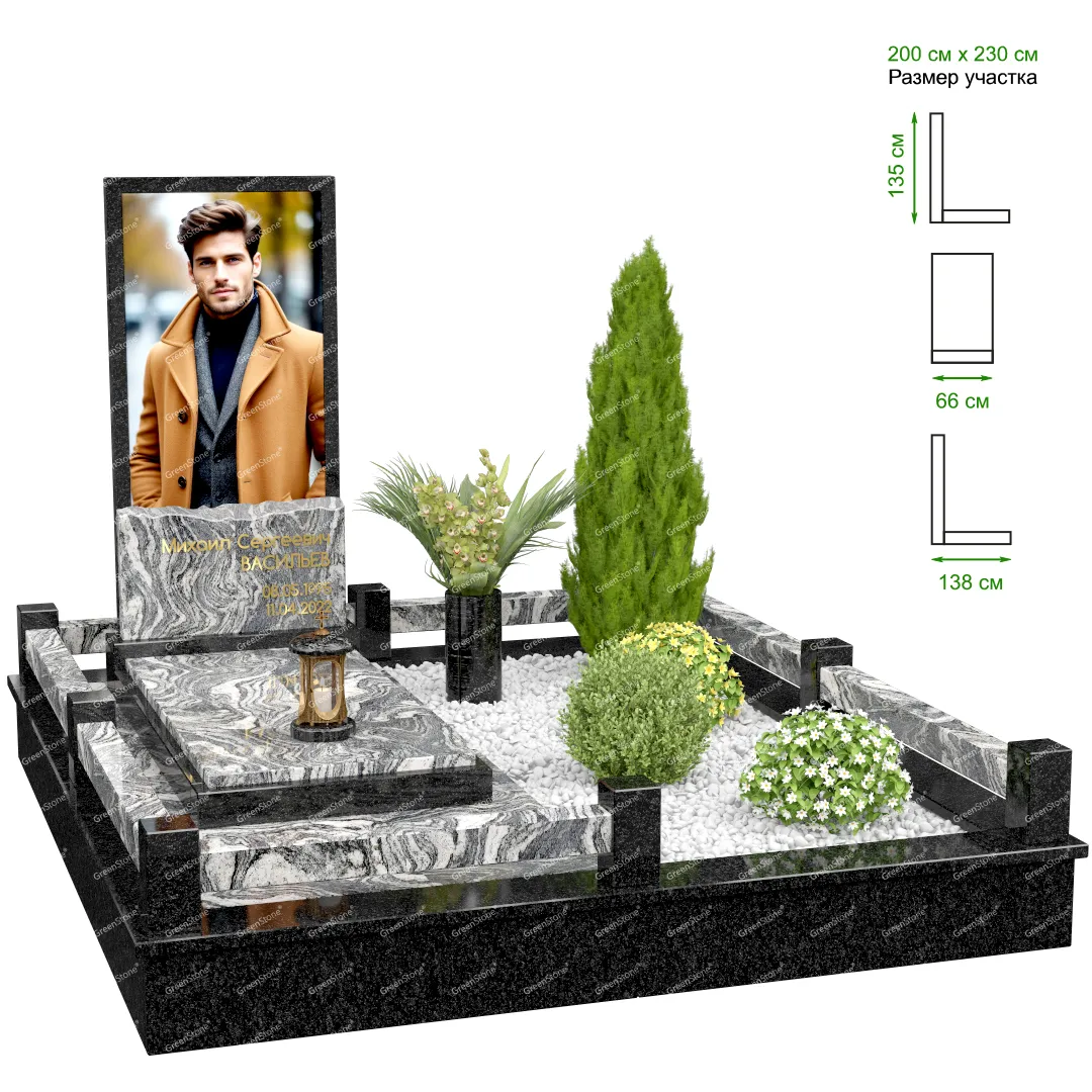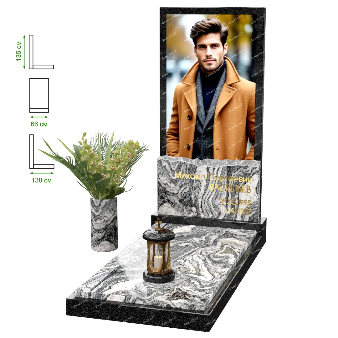 Визуально комплекс отличается от типовой формы не только формой, но и размерами. Массивная стела позволяет дизайнеру реализовать практически любые задумки и пожелания Заказчика, придать готовому изделию солидный вид, раскрыть все достоинства использованного в его изготовлении гранита. Такой габаритный памятник требует профессиональной доставки и установки. Все это также можно заказать в мастерской Грин-Стоун.