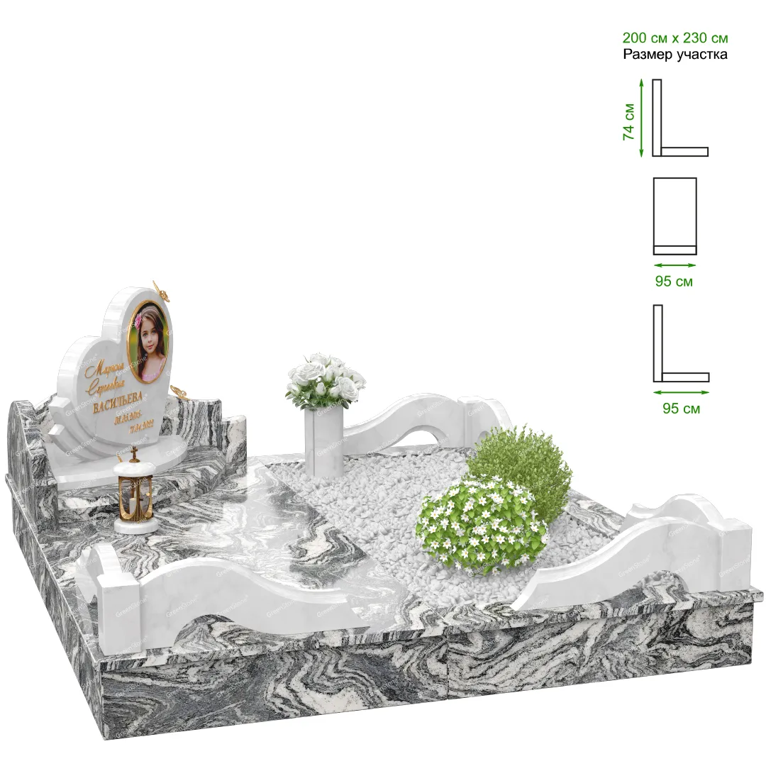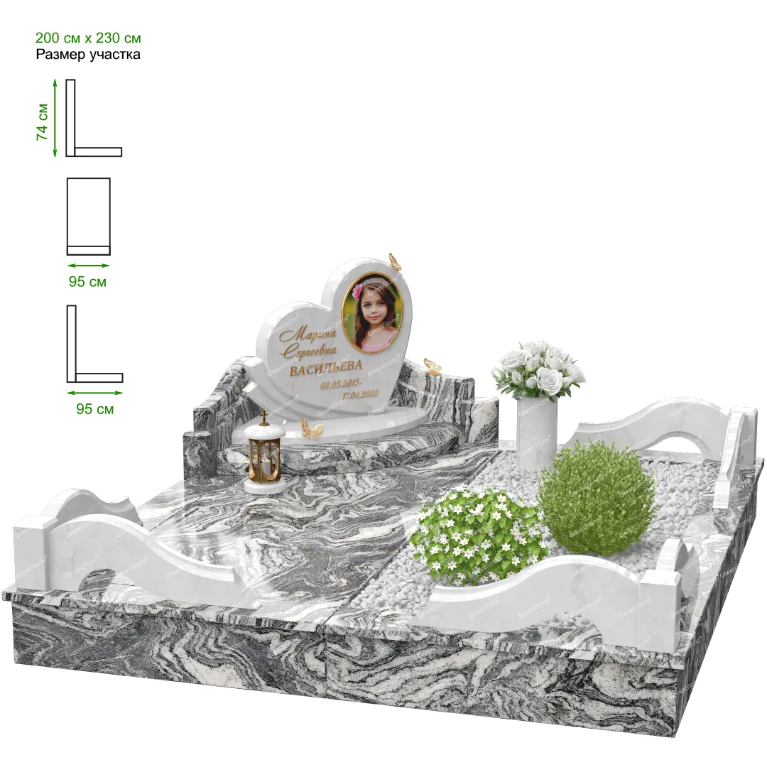 Визуально комплекс отличается от типовой формы не только формой, но и размерами. Массивная стела позволяет дизайнеру реализовать практически любые задумки и пожелания Заказчика, придать готовому изделию солидный вид, раскрыть все достоинства использованного в его изготовлении гранита. Такой габаритный памятник требует профессиональной доставки и установки. Все это также можно заказать в мастерской Грин-Стоун.