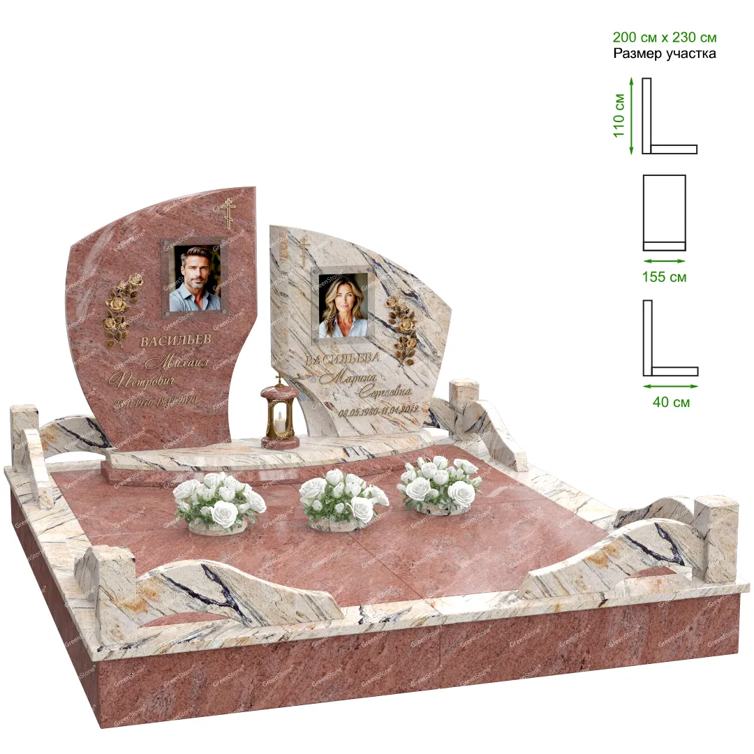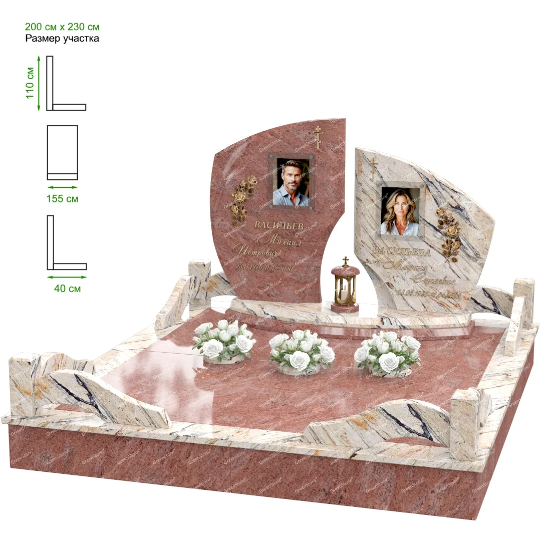 Визуально комплекс отличается от типовой формы не только формой, но и размерами. Массивная стела позволяет дизайнеру реализовать практически любые задумки и пожелания Заказчика, придать готовому изделию солидный вид, раскрыть все достоинства использованного в его изготовлении гранита. Такой габаритный памятник требует профессиональной доставки и установки. Все это также можно заказать в мастерской Грин-Стоун.