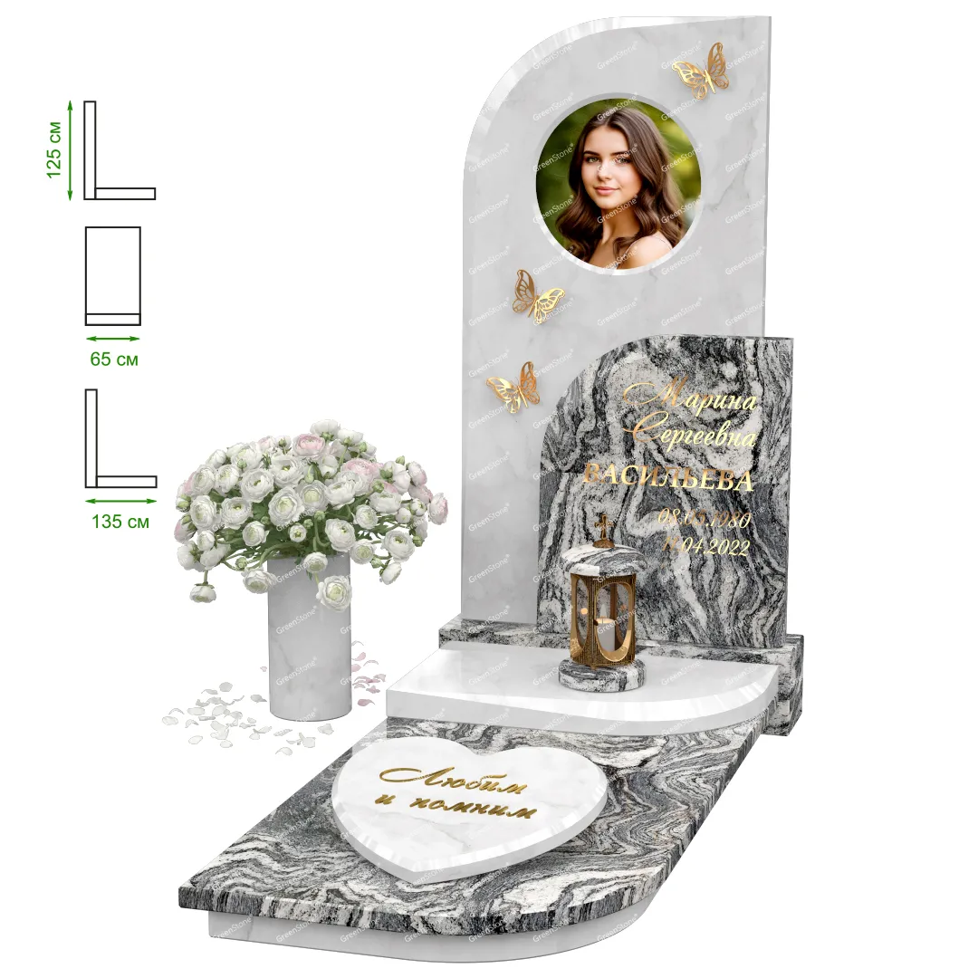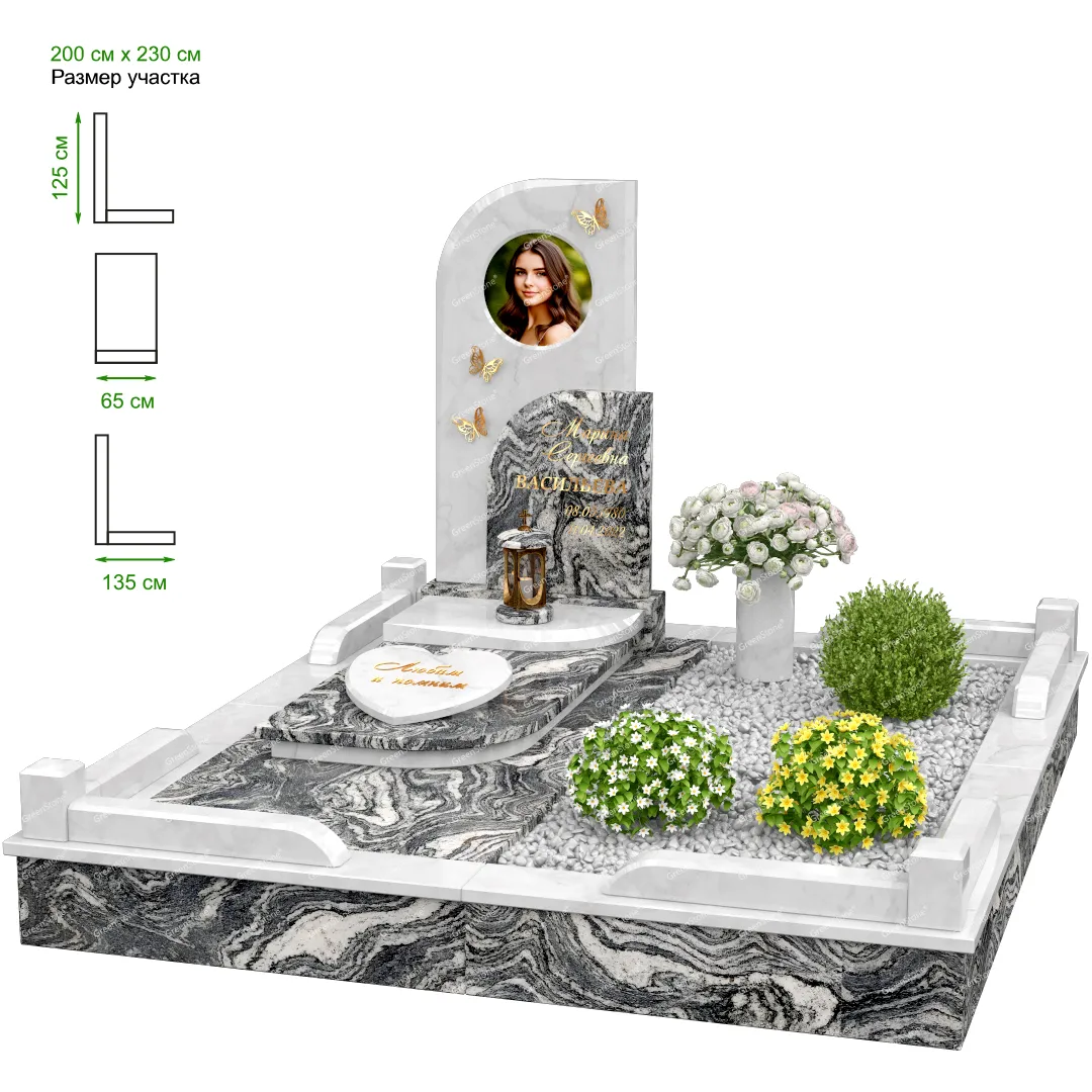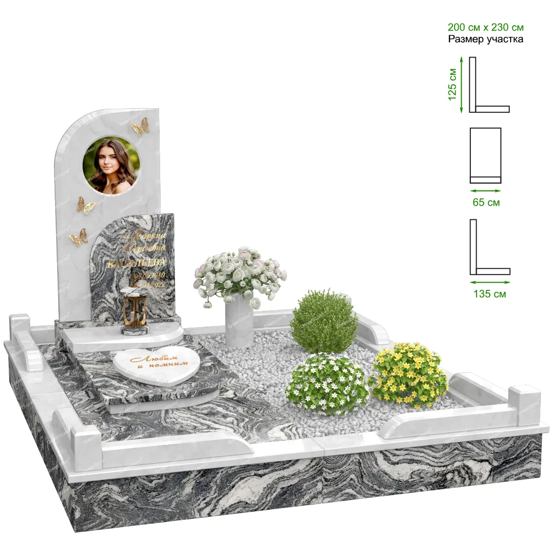 Визуально комплекс отличается от типовой формы не только формой, но и размерами. Массивная стела позволяет дизайнеру реализовать практически любые задумки и пожелания Заказчика, придать готовому изделию солидный вид, раскрыть все достоинства использованного в его изготовлении гранита. Такой габаритный памятник требует профессиональной доставки и установки. Все это также можно заказать в мастерской Грин-Стоун.