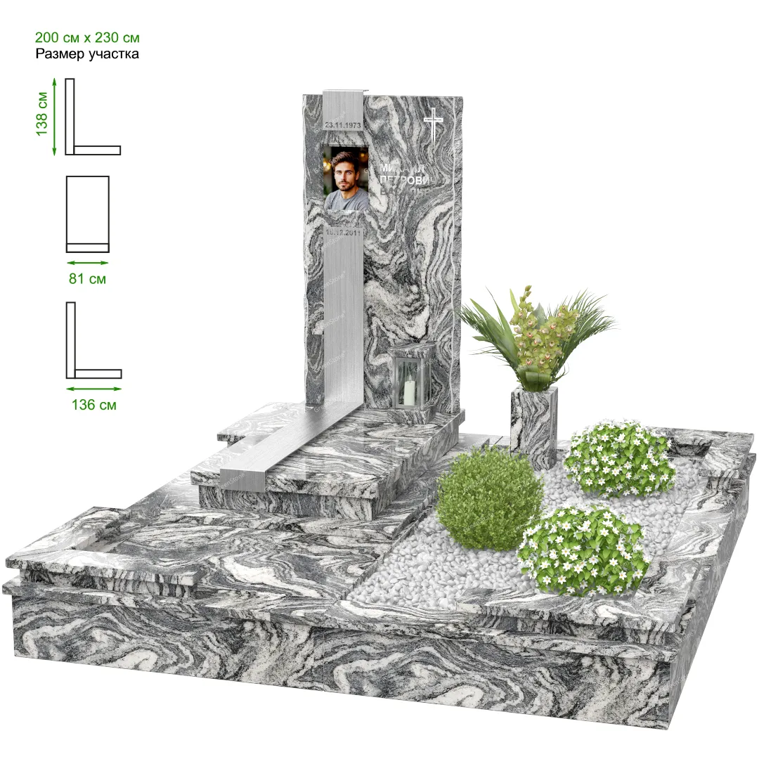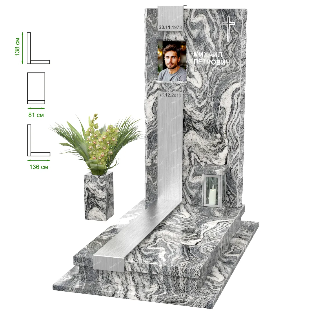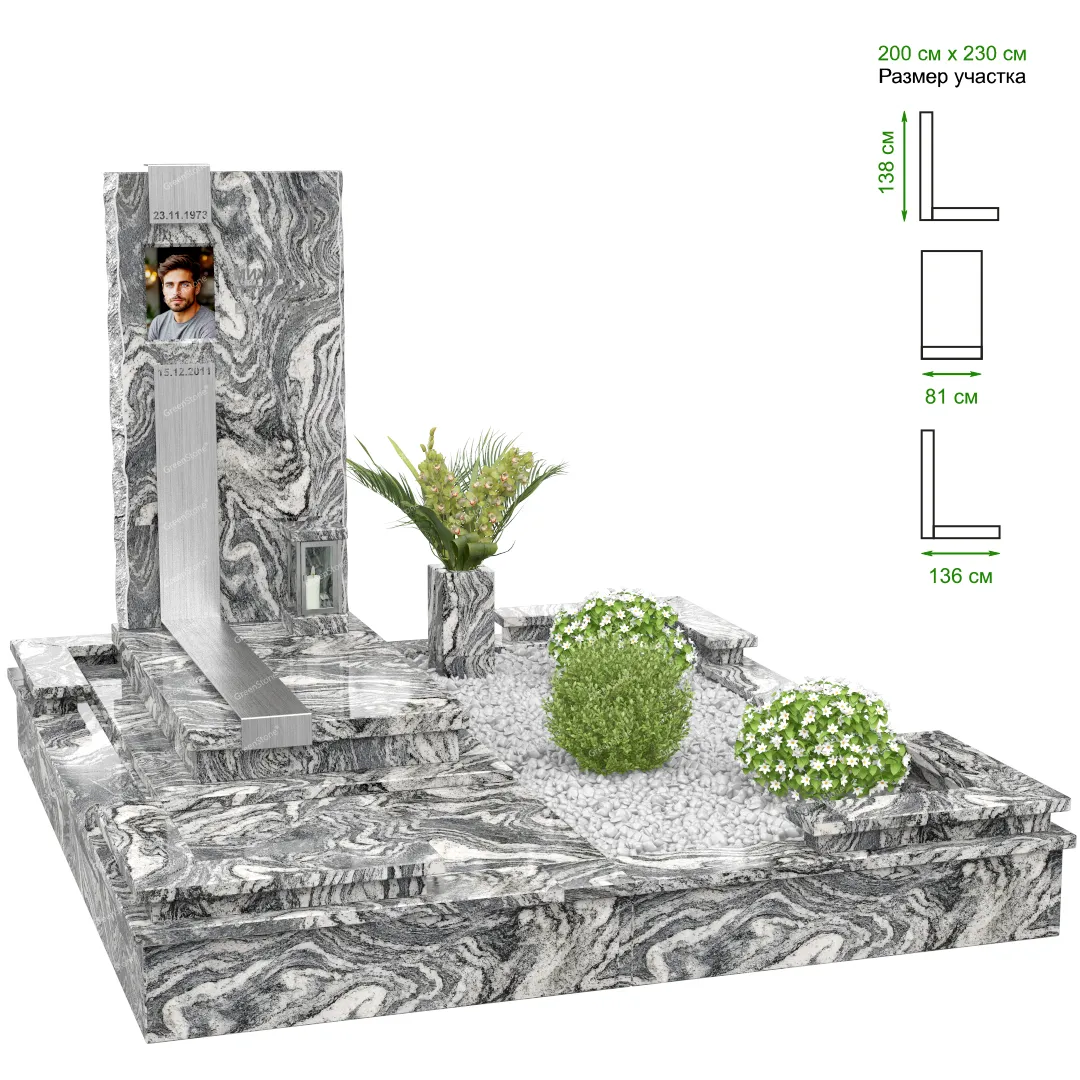 Визуально комплекс отличается от типовой формы не только формой, но и размерами. Массивная стела позволяет дизайнеру реализовать практически любые задумки и пожелания Заказчика, придать готовому изделию солидный вид, раскрыть все достоинства использованного в его изготовлении гранита. Такой габаритный памятник требует профессиональной доставки и установки. Все это также можно заказать в мастерской Грин-Стоун.