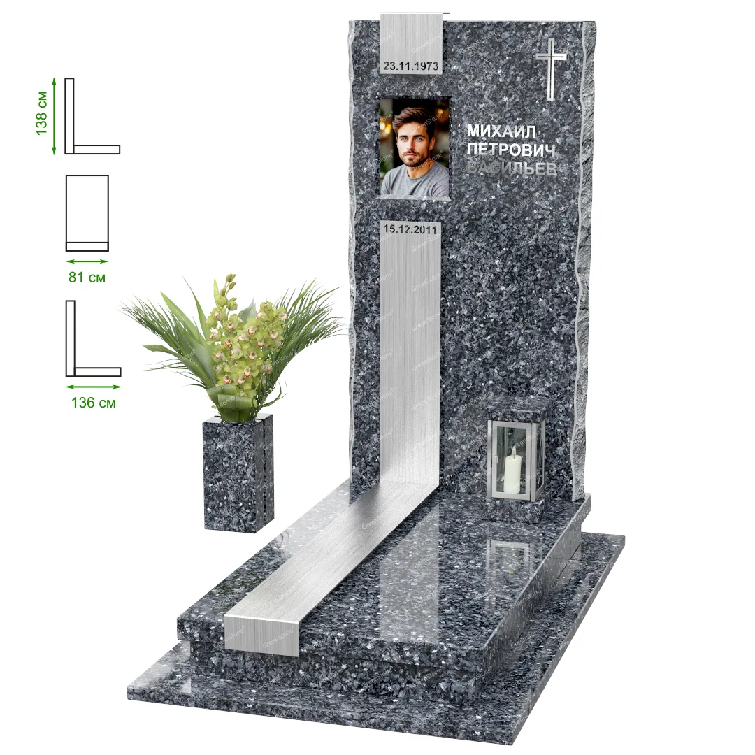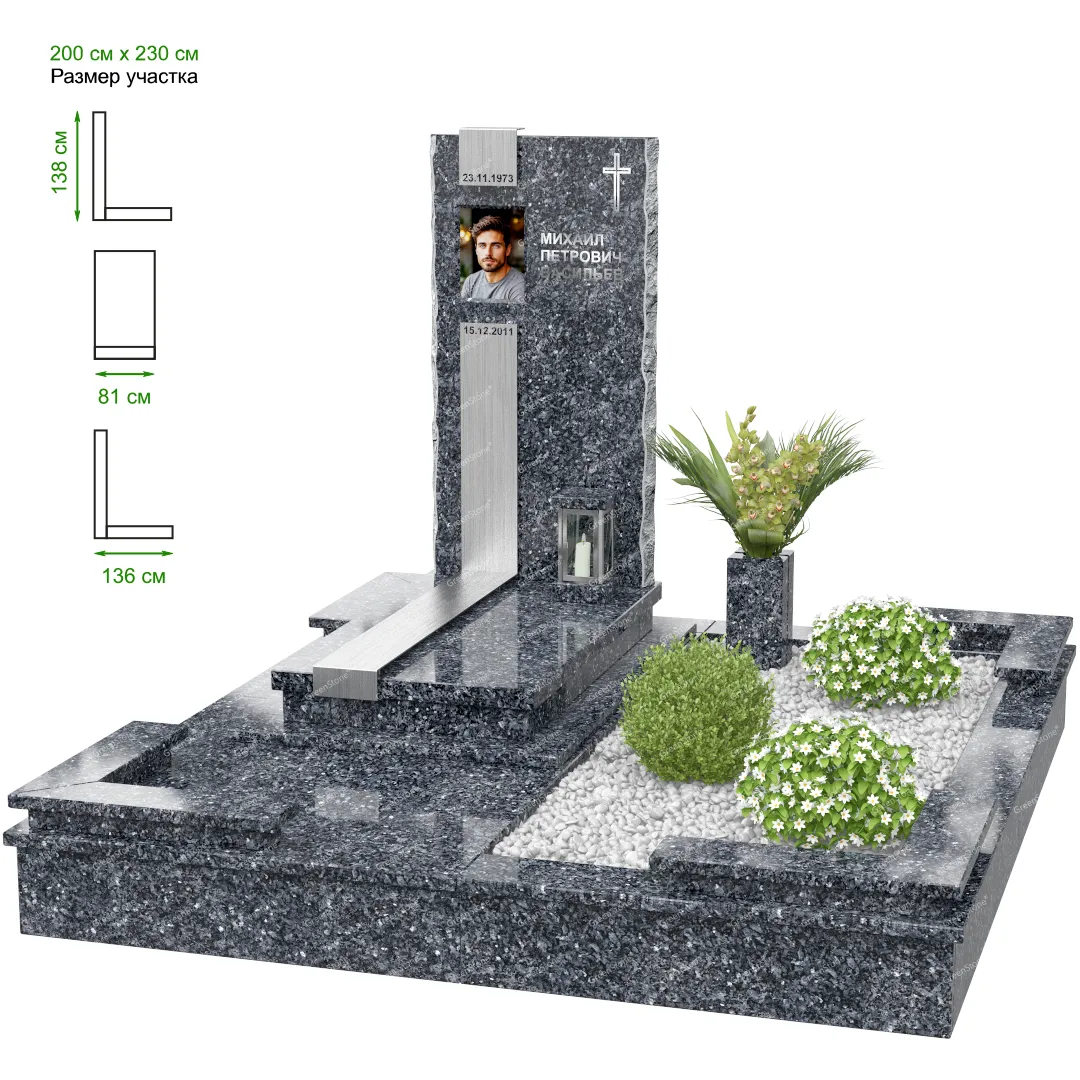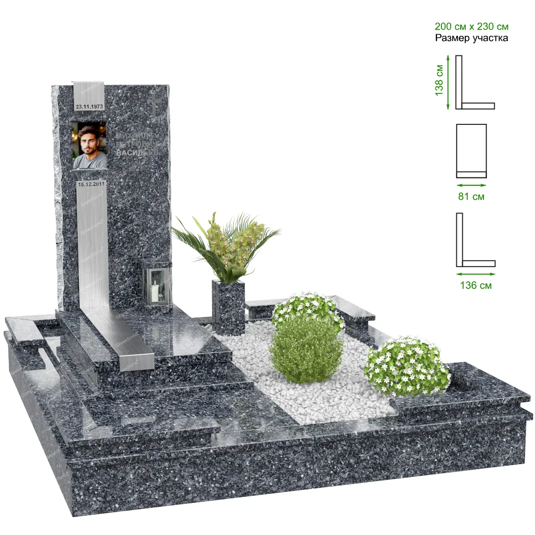 Визуально комплекс отличается от типовой формы не только формой, но и размерами. Массивная стела позволяет дизайнеру реализовать практически любые задумки и пожелания Заказчика, придать готовому изделию солидный вид, раскрыть все достоинства использованного в его изготовлении гранита. Такой габаритный памятник требует профессиональной доставки и установки. Все это также можно заказать в мастерской Грин-Стоун.