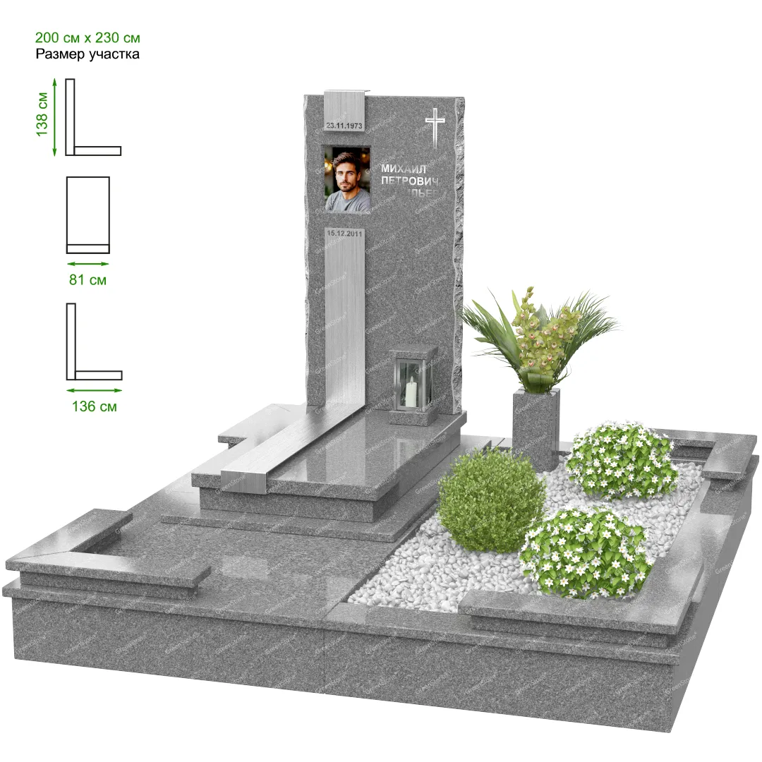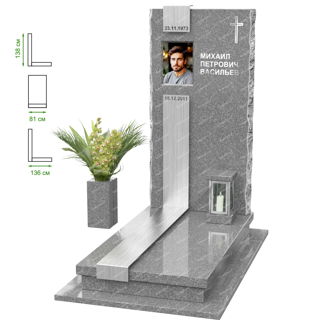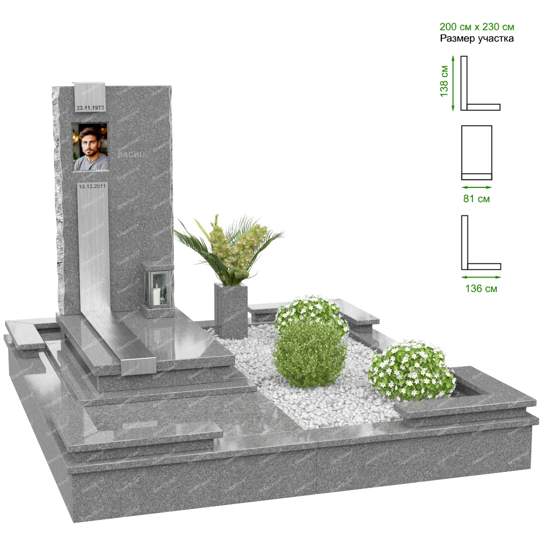 Визуально комплекс отличается от типовой формы не только формой, но и размерами. Массивная стела позволяет дизайнеру реализовать практически любые задумки и пожелания Заказчика, придать готовому изделию солидный вид, раскрыть все достоинства использованного в его изготовлении гранита. Такой габаритный памятник требует профессиональной доставки и установки. Все это также можно заказать в мастерской Грин-Стоун.