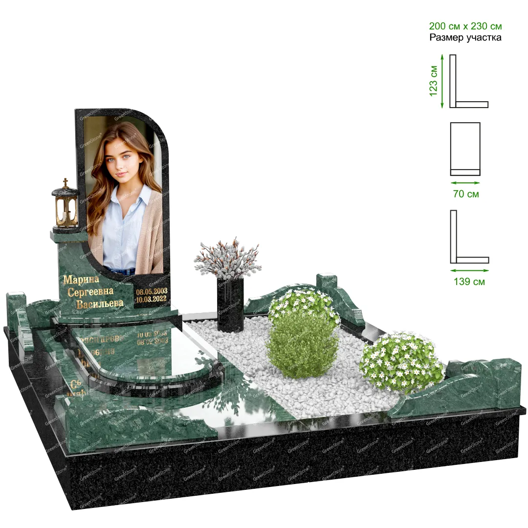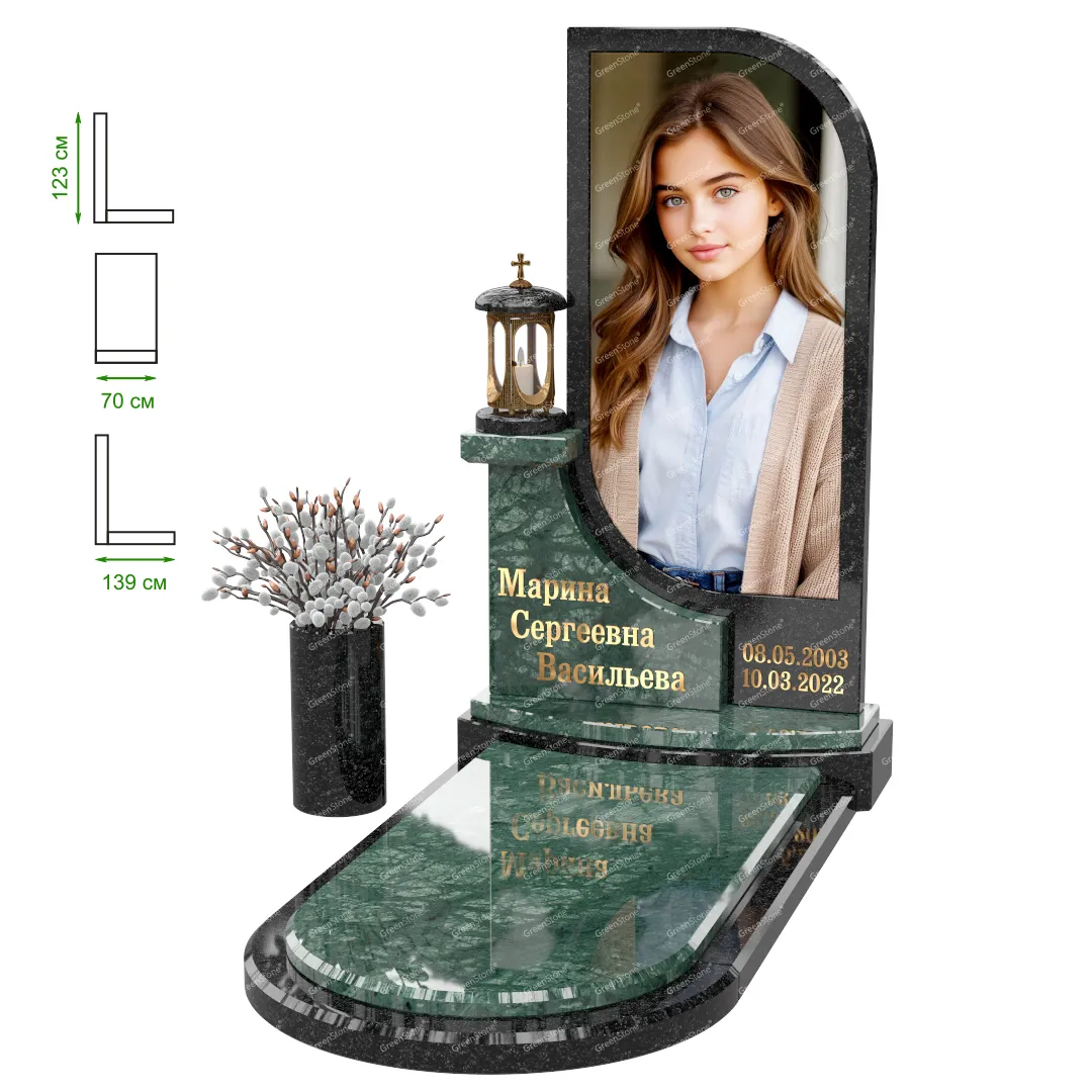 Визуально комплекс отличается от типовой формы не только формой, но и размерами. Массивная стела позволяет дизайнеру реализовать практически любые задумки и пожелания Заказчика, придать готовому изделию солидный вид, раскрыть все достоинства использованного в его изготовлении гранита. Такой габаритный памятник требует профессиональной доставки и установки. Все это также можно заказать в мастерской Грин-Стоун.