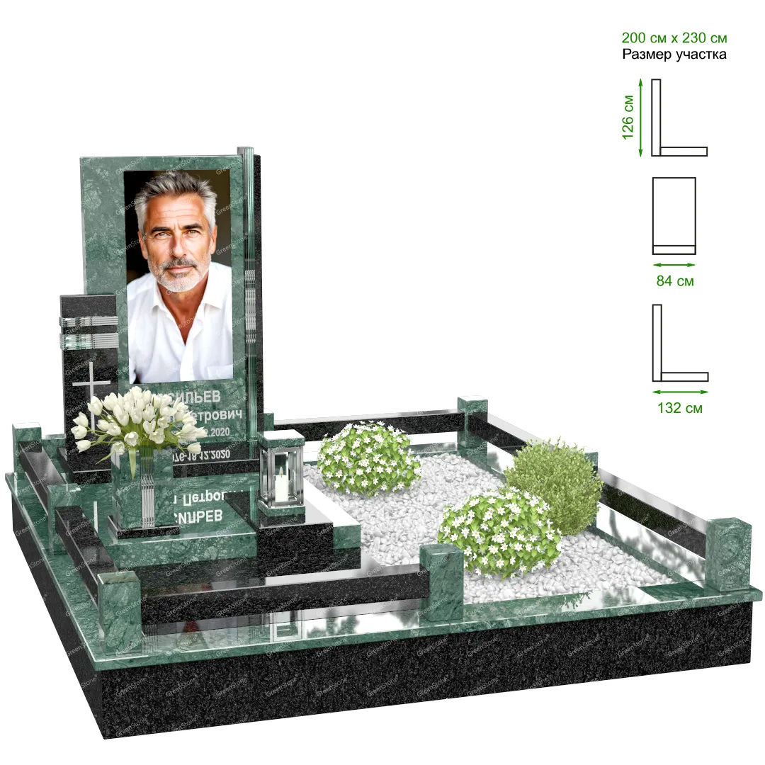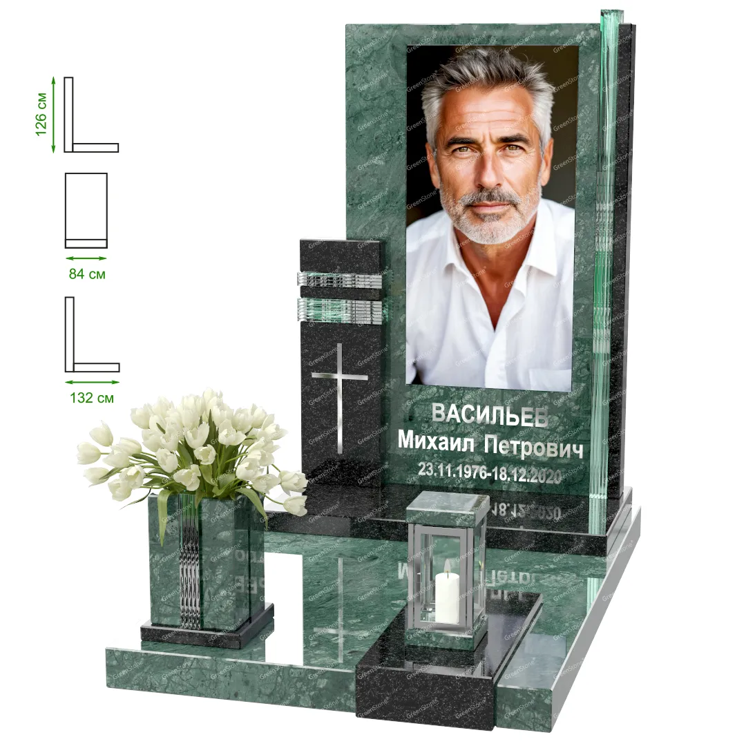 Визуально комплекс отличается от типовой формы не только формой, но и размерами. Массивная стела позволяет дизайнеру реализовать практически любые задумки и пожелания Заказчика, придать готовому изделию солидный вид, раскрыть все достоинства использованного в его изготовлении гранита. Такой габаритный памятник требует профессиональной доставки и установки. Все это также можно заказать в мастерской Грин-Стоун.