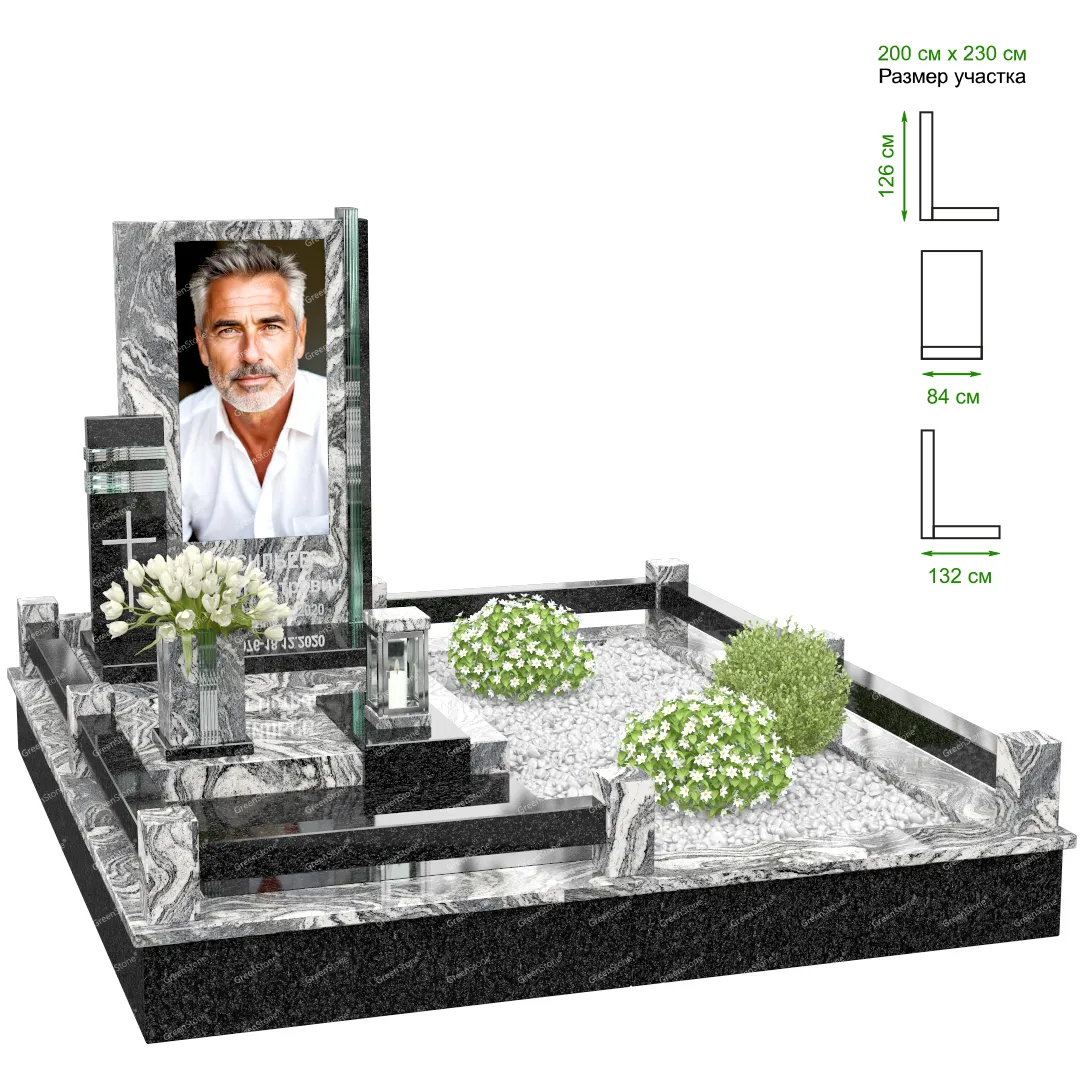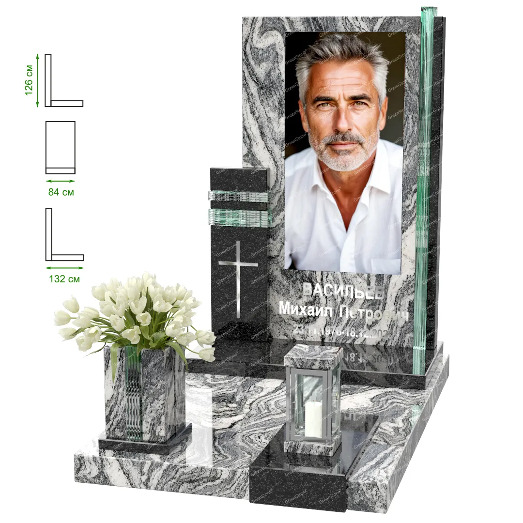 Визуально комплекс отличается от типовой формы не только формой, но и размерами. Массивная стела позволяет дизайнеру реализовать практически любые задумки и пожелания Заказчика, придать готовому изделию солидный вид, раскрыть все достоинства использованного в его изготовлении гранита. Такой габаритный памятник требует профессиональной доставки и установки. Все это также можно заказать в мастерской Грин-Стоун.