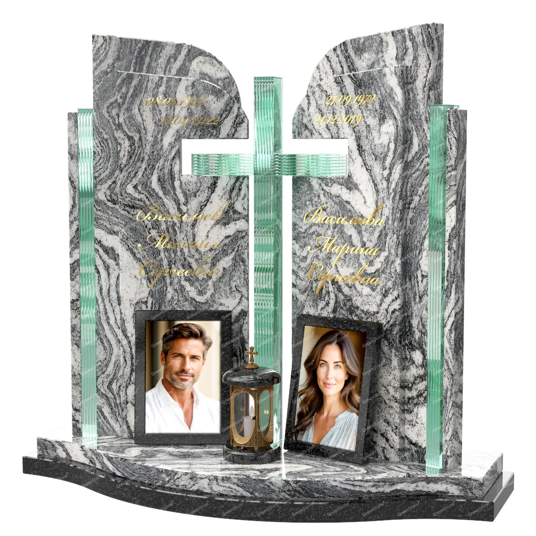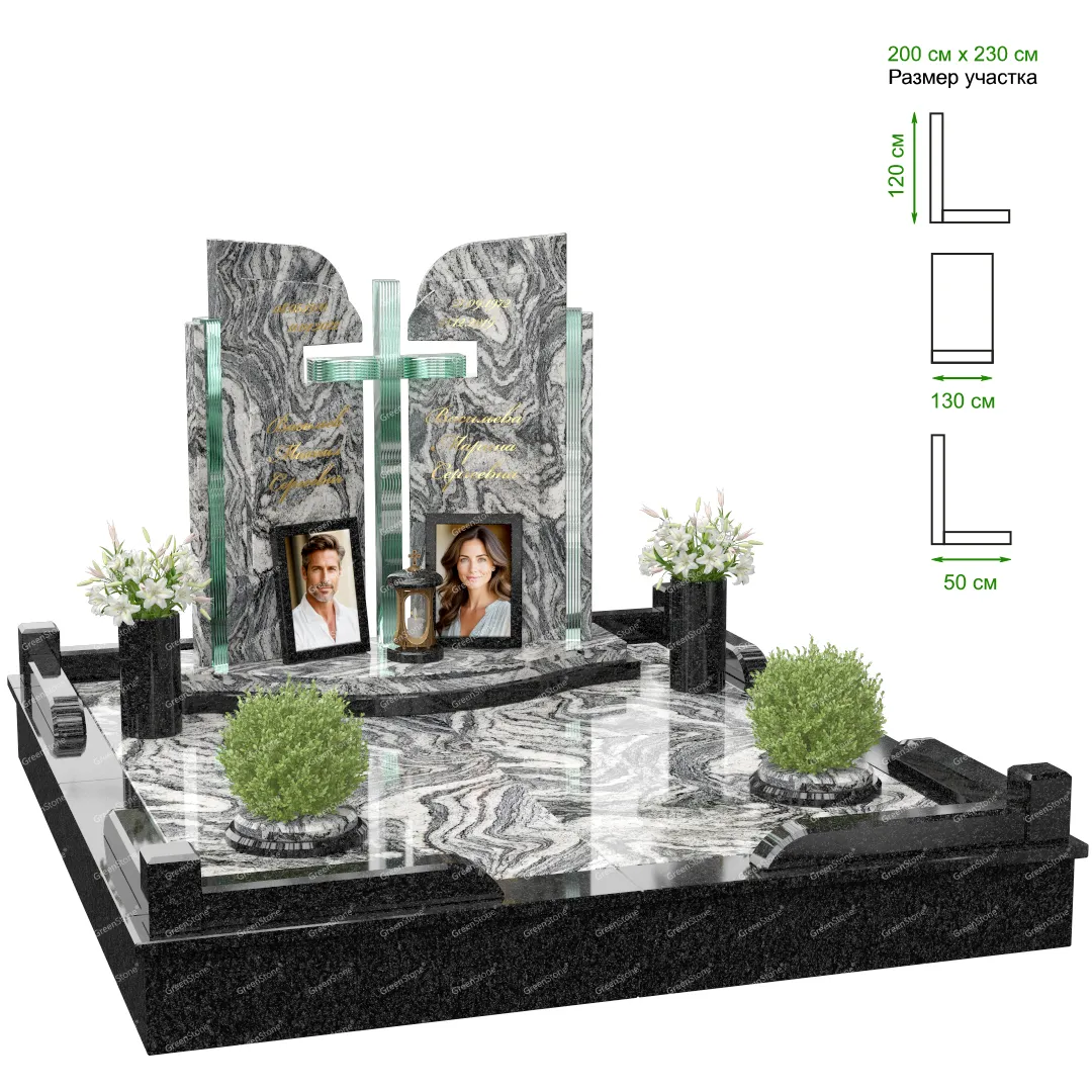Визуально комплекс отличается от типовой формы не только формой, но и размерами. Массивная стела позволяет дизайнеру реализовать практически любые задумки и пожелания Заказчика, придать готовому изделию солидный вид, раскрыть все достоинства использованного в его изготовлении гранита. Такой габаритный памятник требует профессиональной доставки и установки. Все это также можно заказать в мастерской Грин-Стоун.