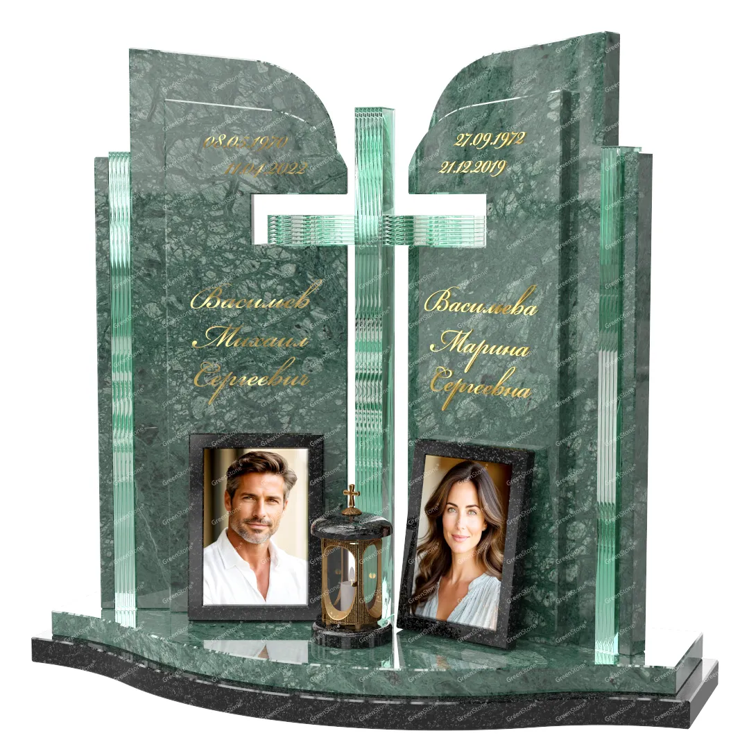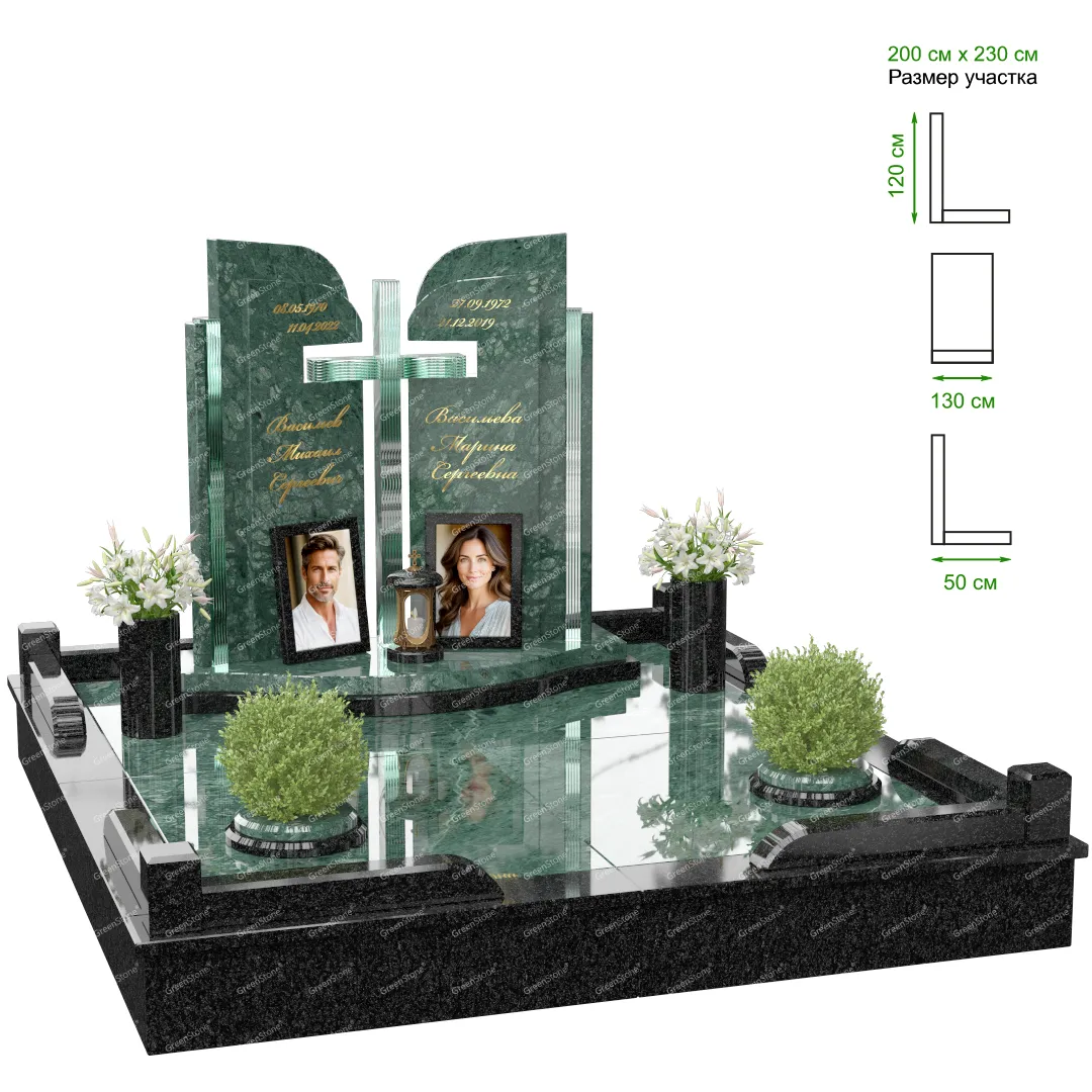 Визуально комплекс отличается от типовой формы не только формой, но и размерами. Массивная стела позволяет дизайнеру реализовать практически любые задумки и пожелания Заказчика, придать готовому изделию солидный вид, раскрыть все достоинства использованного в его изготовлении гранита. Такой габаритный памятник требует профессиональной доставки и установки. Все это также можно заказать в мастерской Грин-Стоун.