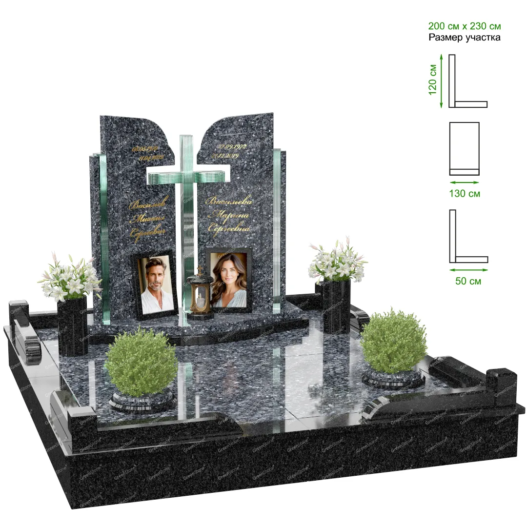 Визуально комплекс отличается от типовой формы не только формой, но и размерами. Массивная стела позволяет дизайнеру реализовать практически любые задумки и пожелания Заказчика, придать готовому изделию солидный вид, раскрыть все достоинства использованного в его изготовлении гранита. Такой габаритный памятник требует профессиональной доставки и установки. Все это также можно заказать в мастерской Грин-Стоун.