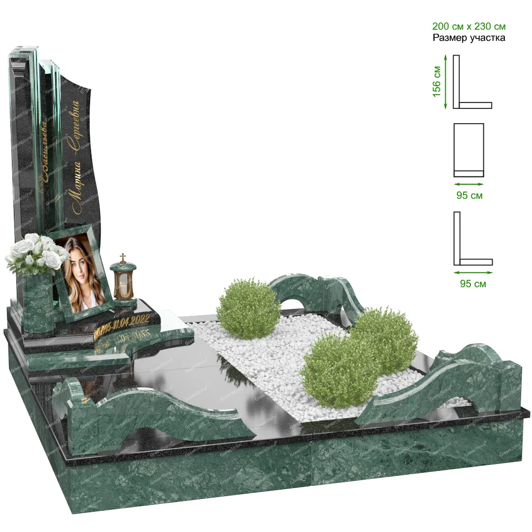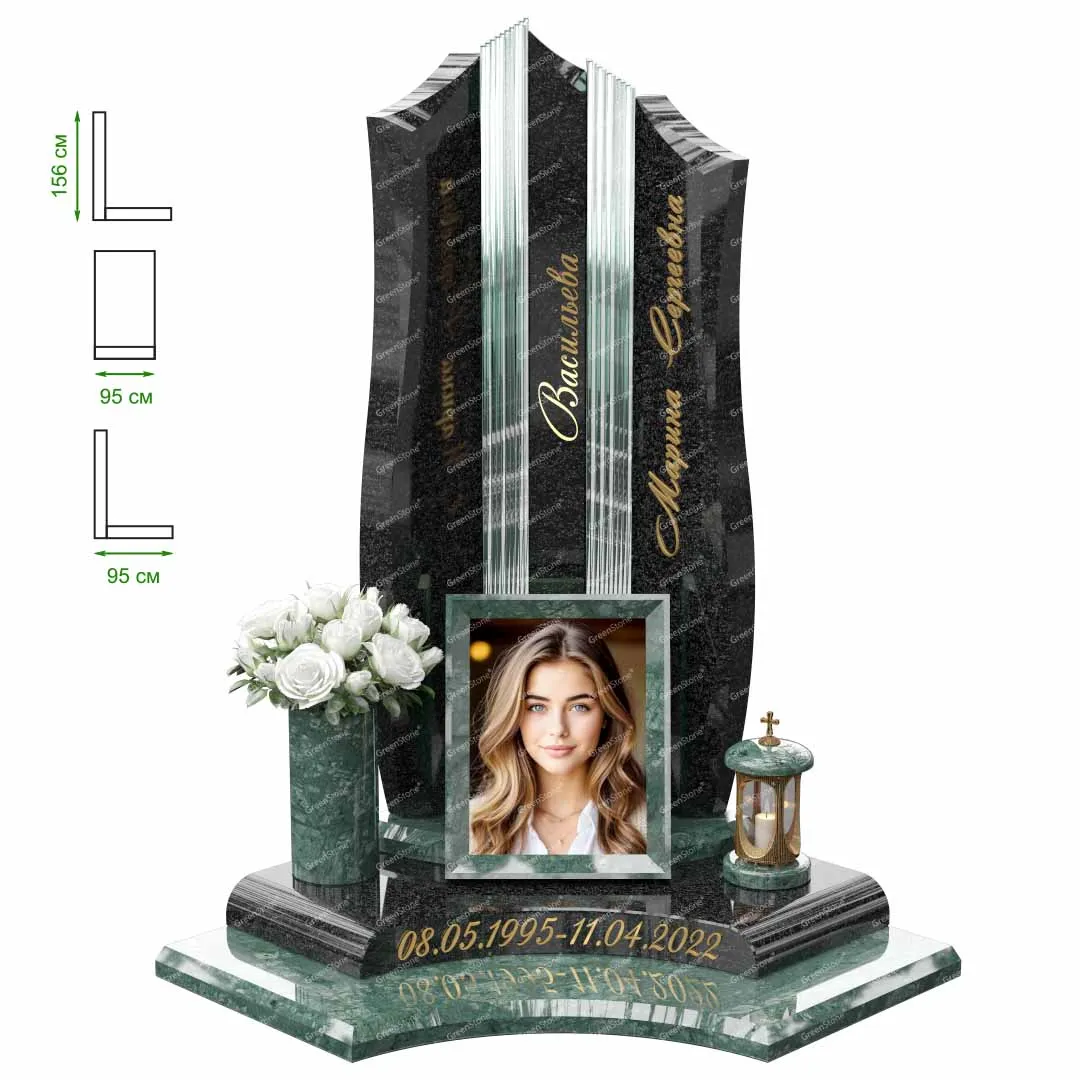 Визуально комплекс отличается от типовой формы не только формой, но и размерами. Массивная стела позволяет дизайнеру реализовать практически любые задумки и пожелания Заказчика, придать готовому изделию солидный вид, раскрыть все достоинства использованного в его изготовлении гранита. Такой габаритный памятник требует профессиональной доставки и установки. Все это также можно заказать в мастерской Грин-Стоун.