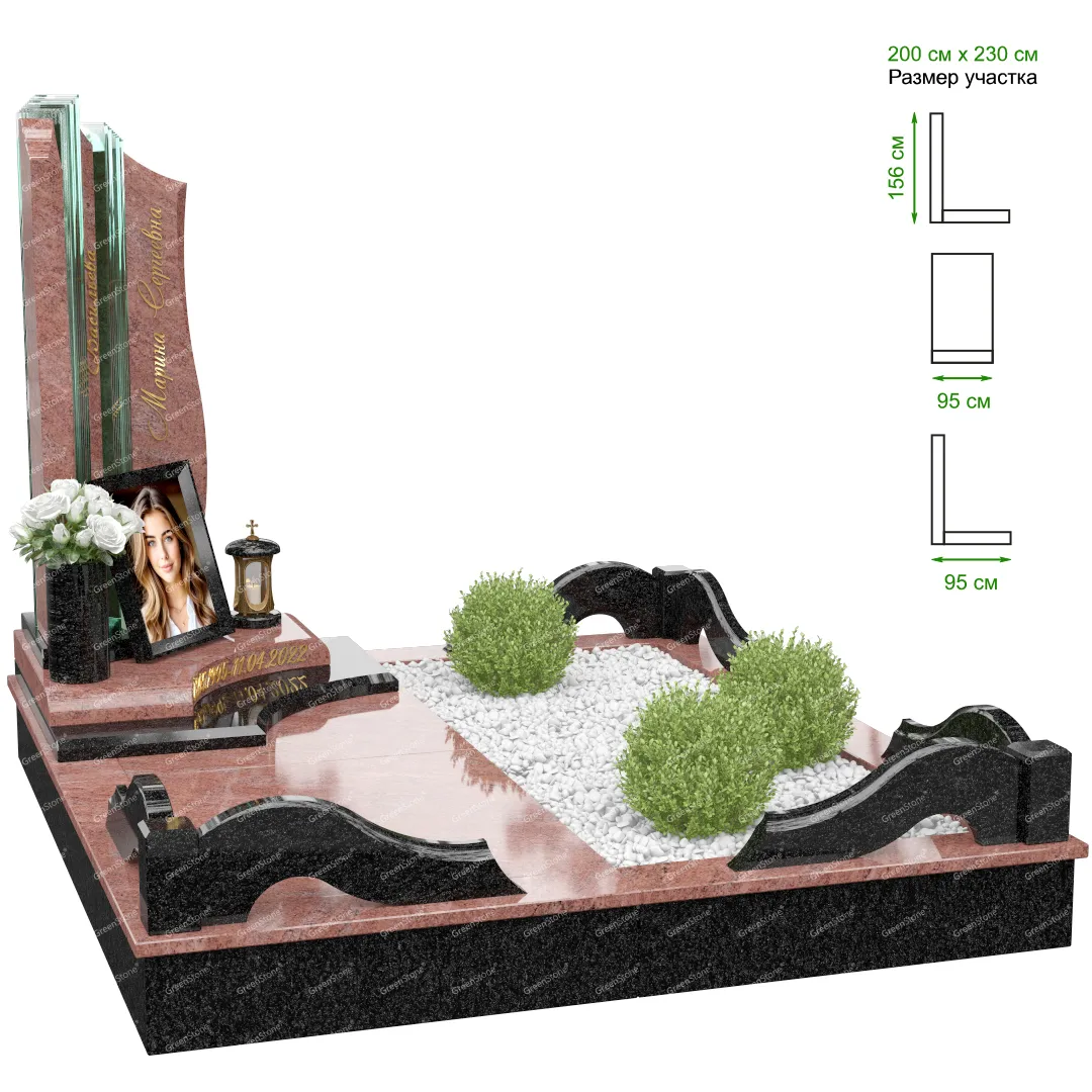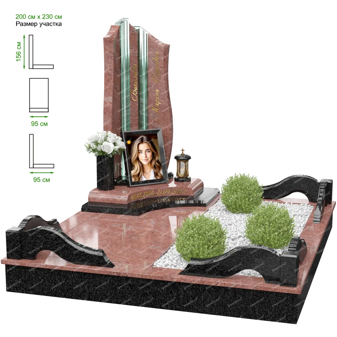 Визуально комплекс отличается от типовой формы не только формой, но и размерами. Массивная стела позволяет дизайнеру реализовать практически любые задумки и пожелания Заказчика, придать готовому изделию солидный вид, раскрыть все достоинства использованного в его изготовлении гранита. Такой габаритный памятник требует профессиональной доставки и установки. Все это также можно заказать в мастерской Грин-Стоун.