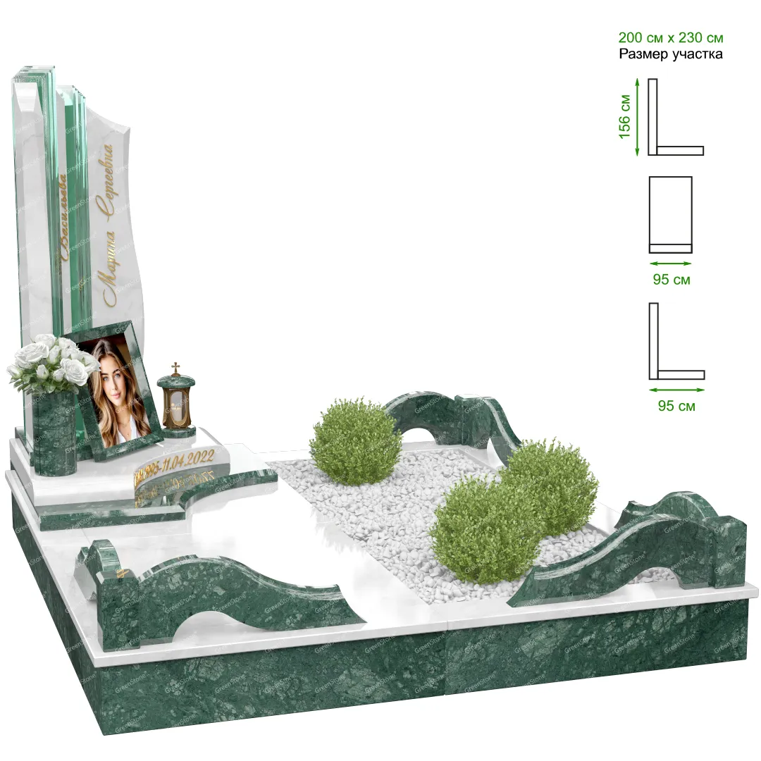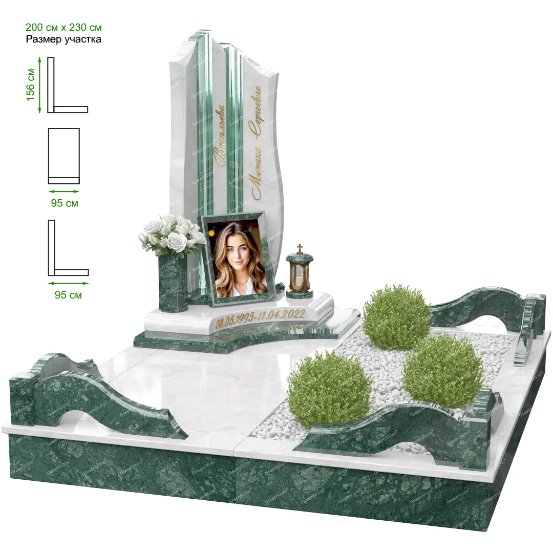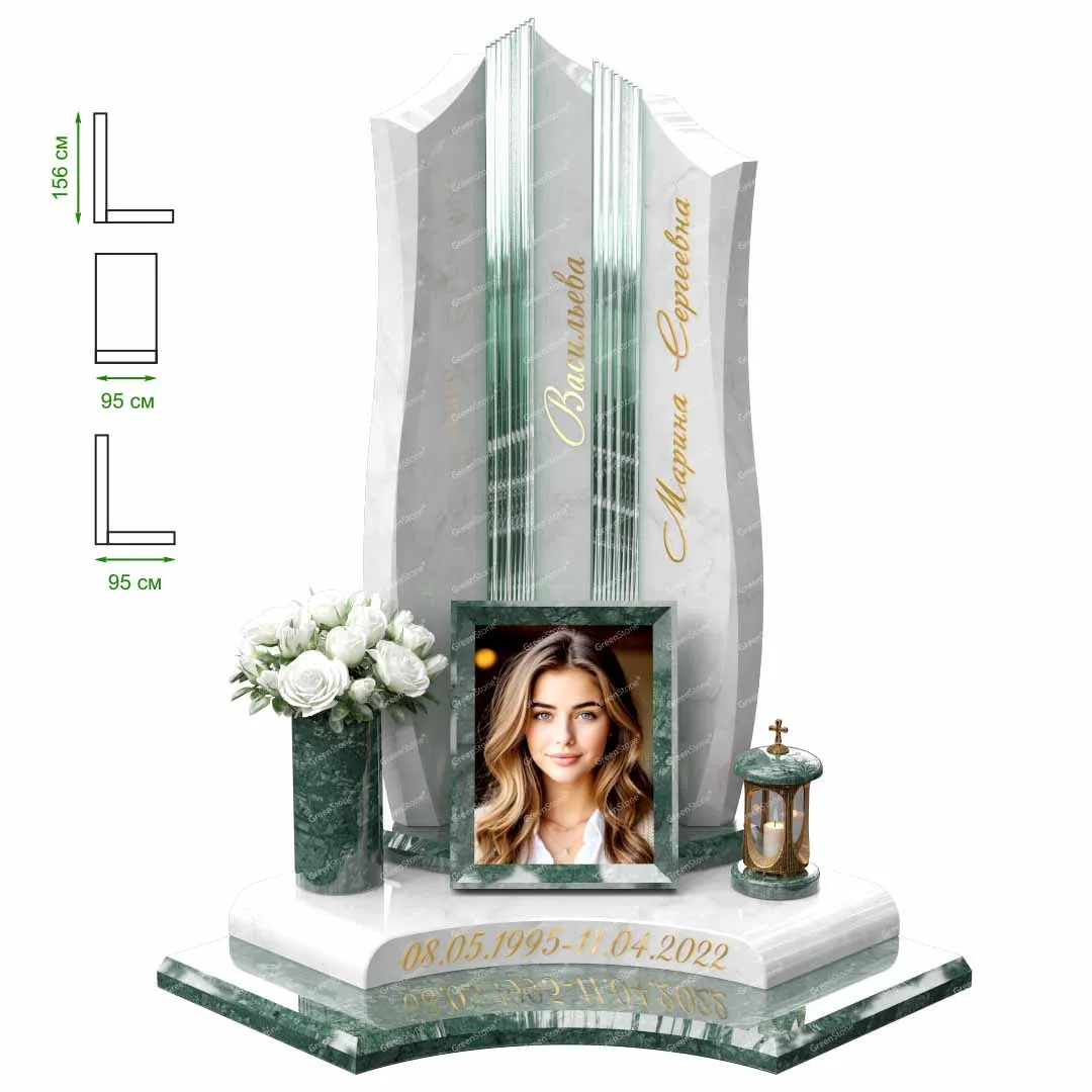 Визуально комплекс отличается от типовой формы не только формой, но и размерами. Массивная стела позволяет дизайнеру реализовать практически любые задумки и пожелания Заказчика, придать готовому изделию солидный вид, раскрыть все достоинства использованного в его изготовлении гранита. Такой габаритный памятник требует профессиональной доставки и установки. Все это также можно заказать в мастерской Грин-Стоун.