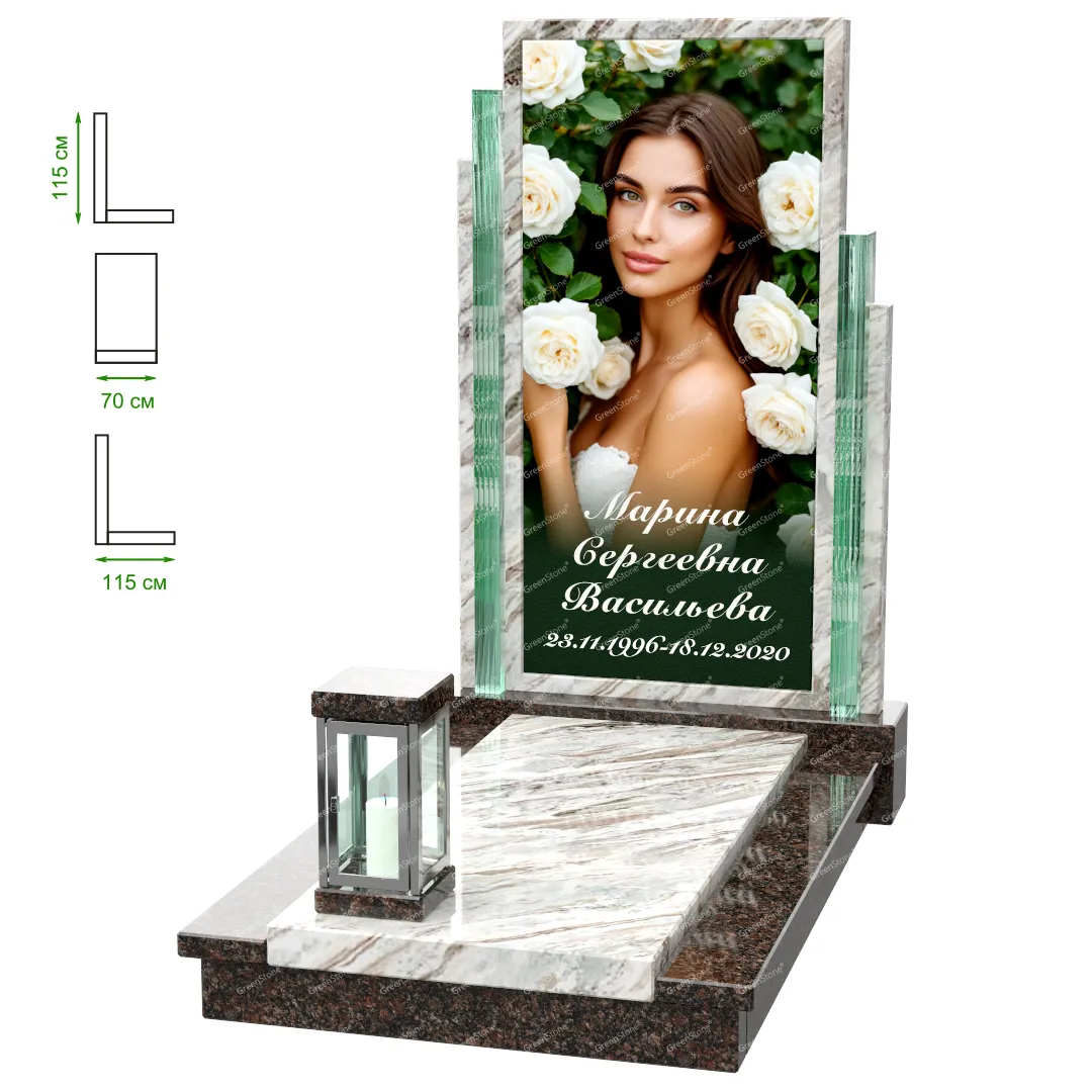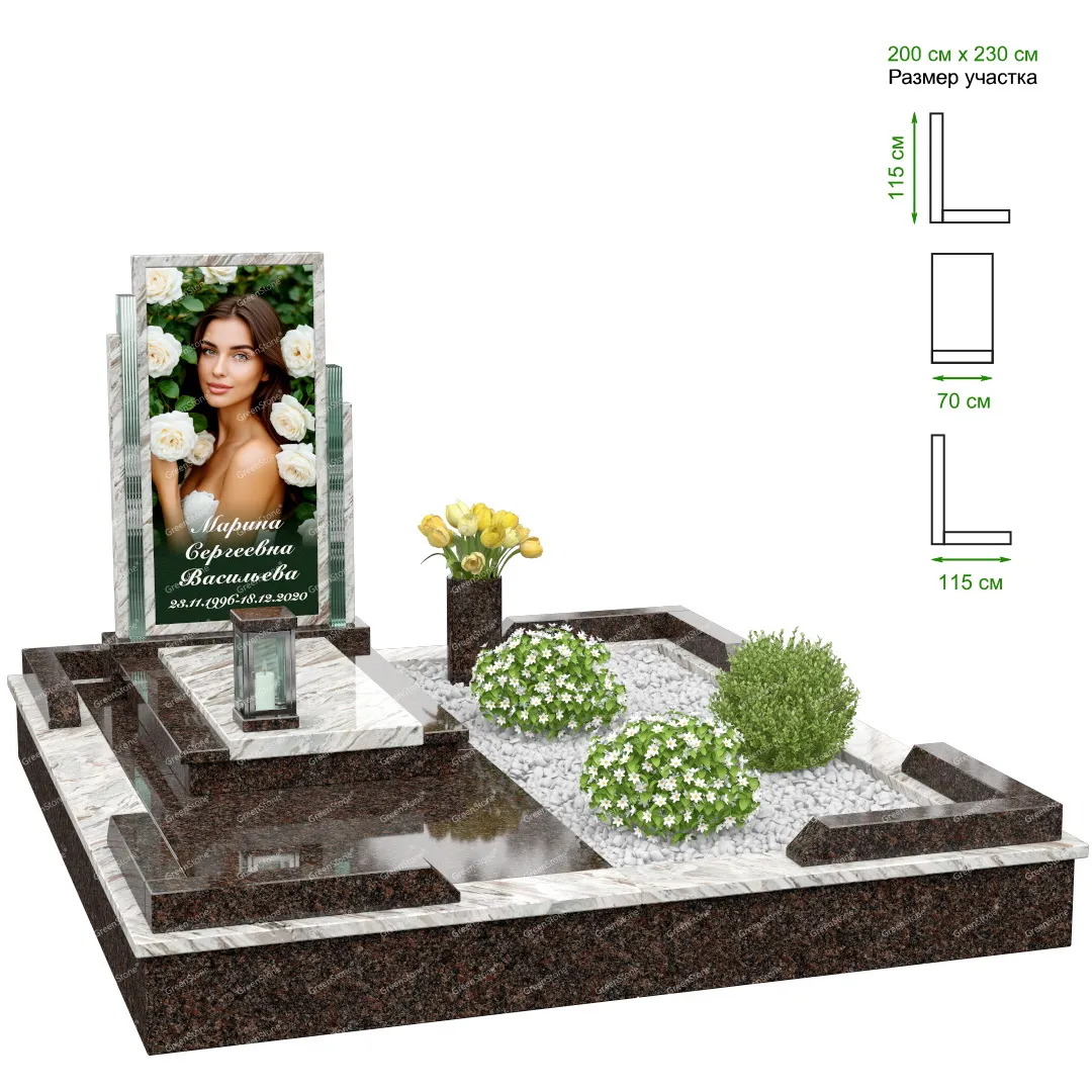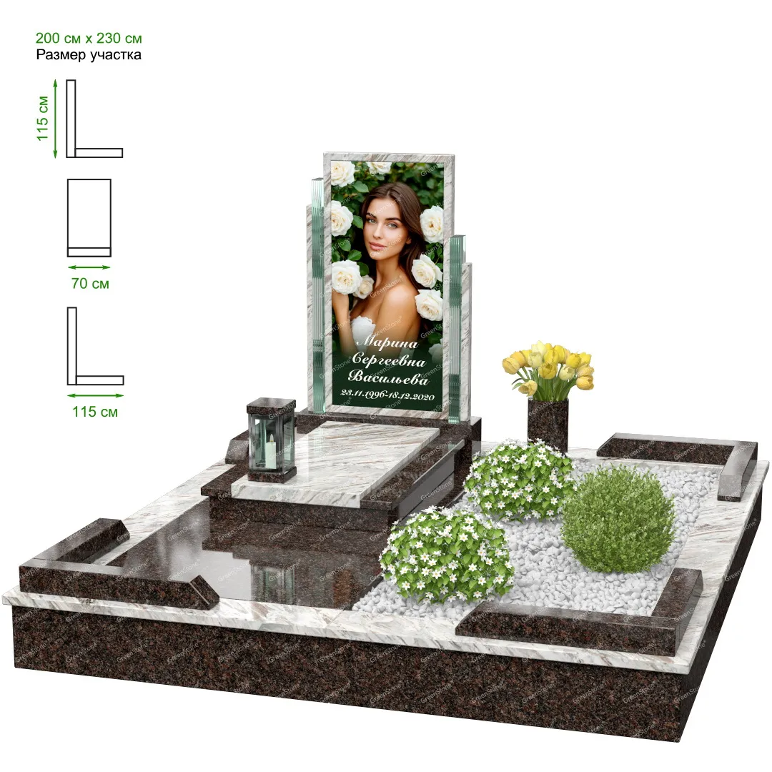 Визуально комплекс отличается от типовой формы не только формой, но и размерами. Массивная стела позволяет дизайнеру реализовать практически любые задумки и пожелания Заказчика, придать готовому изделию солидный вид, раскрыть все достоинства использованного в его изготовлении гранита. Такой габаритный памятник требует профессиональной доставки и установки. Все это также можно заказать в мастерской Грин-Стоун.