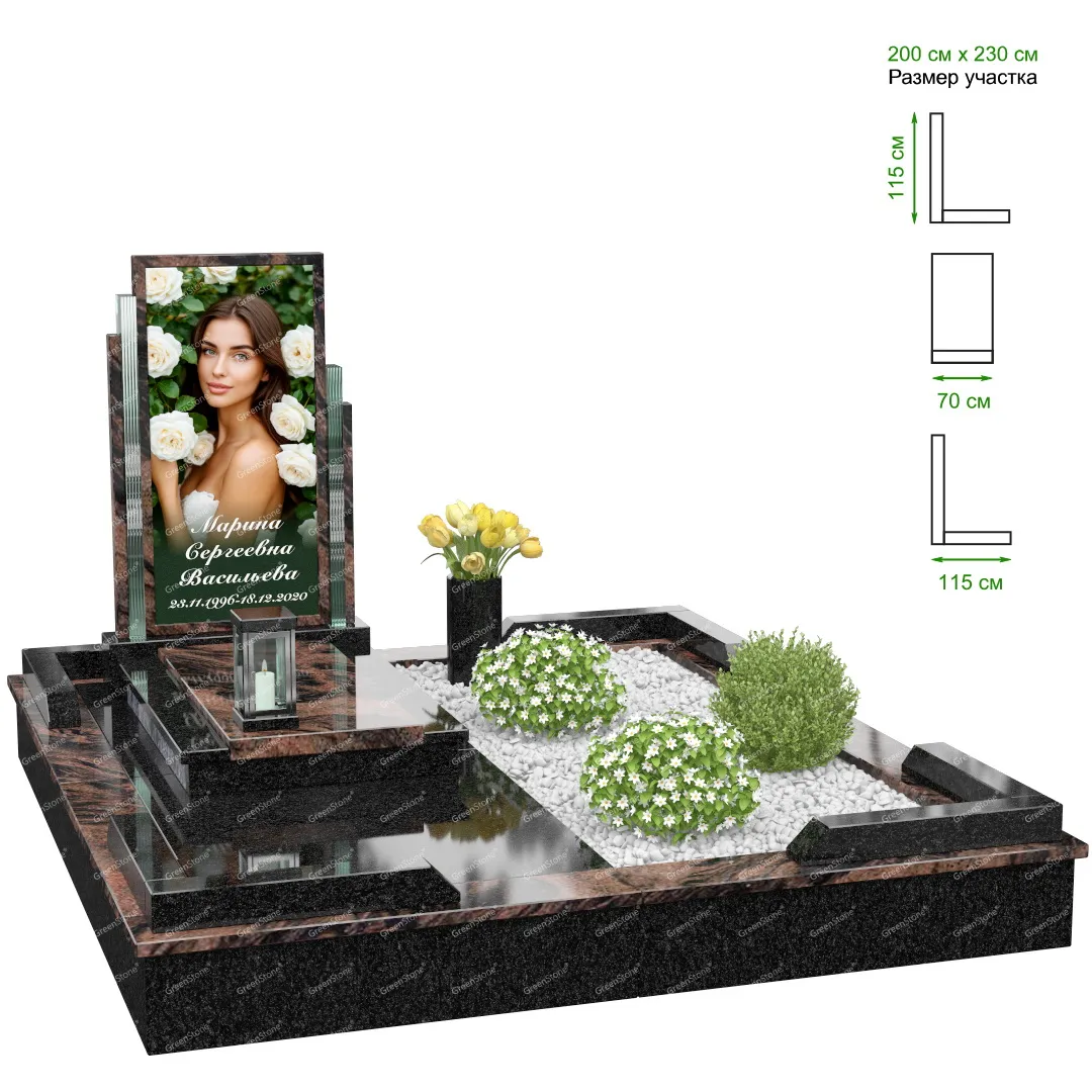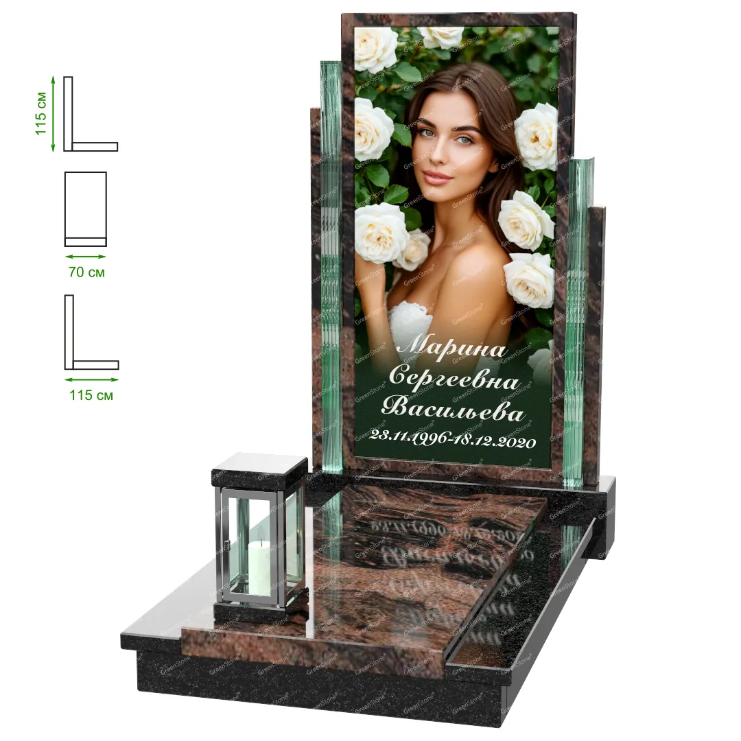 Визуально комплекс отличается от типовой формы не только формой, но и размерами. Массивная стела позволяет дизайнеру реализовать практически любые задумки и пожелания Заказчика, придать готовому изделию солидный вид, раскрыть все достоинства использованного в его изготовлении гранита. Такой габаритный памятник требует профессиональной доставки и установки. Все это также можно заказать в мастерской Грин-Стоун.