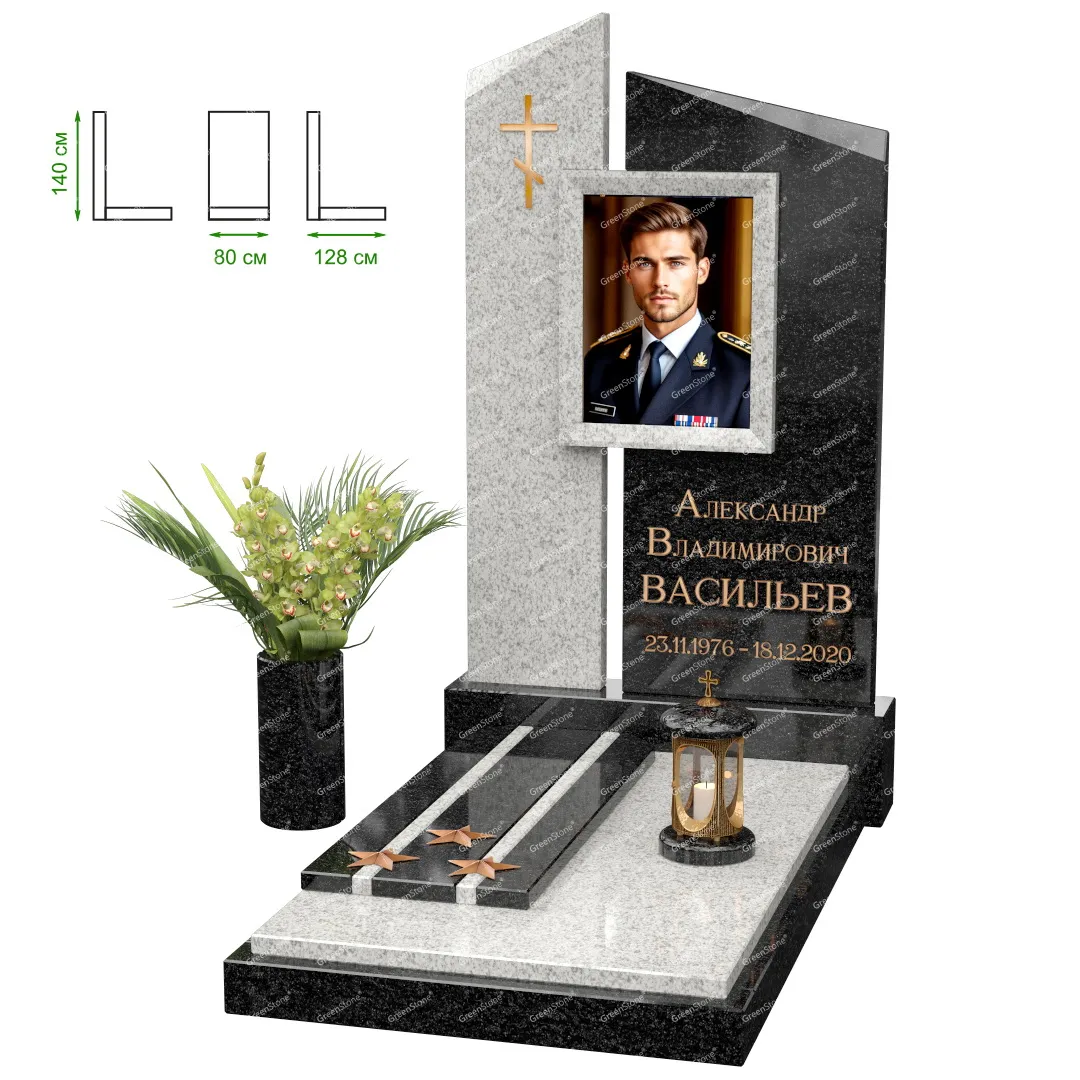 Визуально комплекс отличается от типовой формы не только формой, но и размерами. Массивная стела позволяет дизайнеру реализовать практически любые задумки и пожелания Заказчика, придать готовому изделию солидный вид, раскрыть все достоинства использованного в его изготовлении гранита. Такой габаритный памятник требует профессиональной доставки и установки. Все это также можно заказать в мастерской Грин-Стоун.