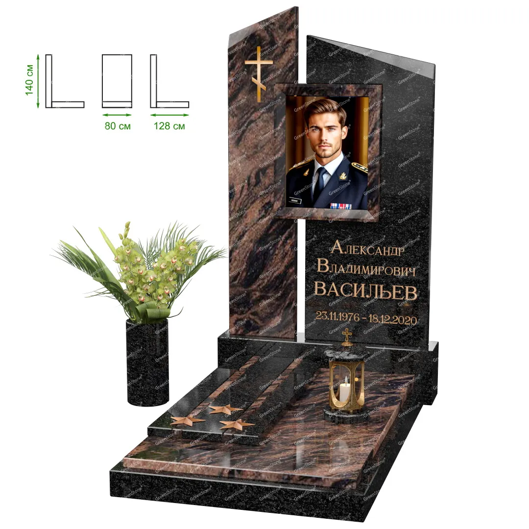 Визуально комплекс отличается от типовой формы не только формой, но и размерами. Массивная стела позволяет дизайнеру реализовать практически любые задумки и пожелания Заказчика, придать готовому изделию солидный вид, раскрыть все достоинства использованного в его изготовлении гранита. Такой габаритный памятник требует профессиональной доставки и установки. Все это также можно заказать в мастерской Грин-Стоун.