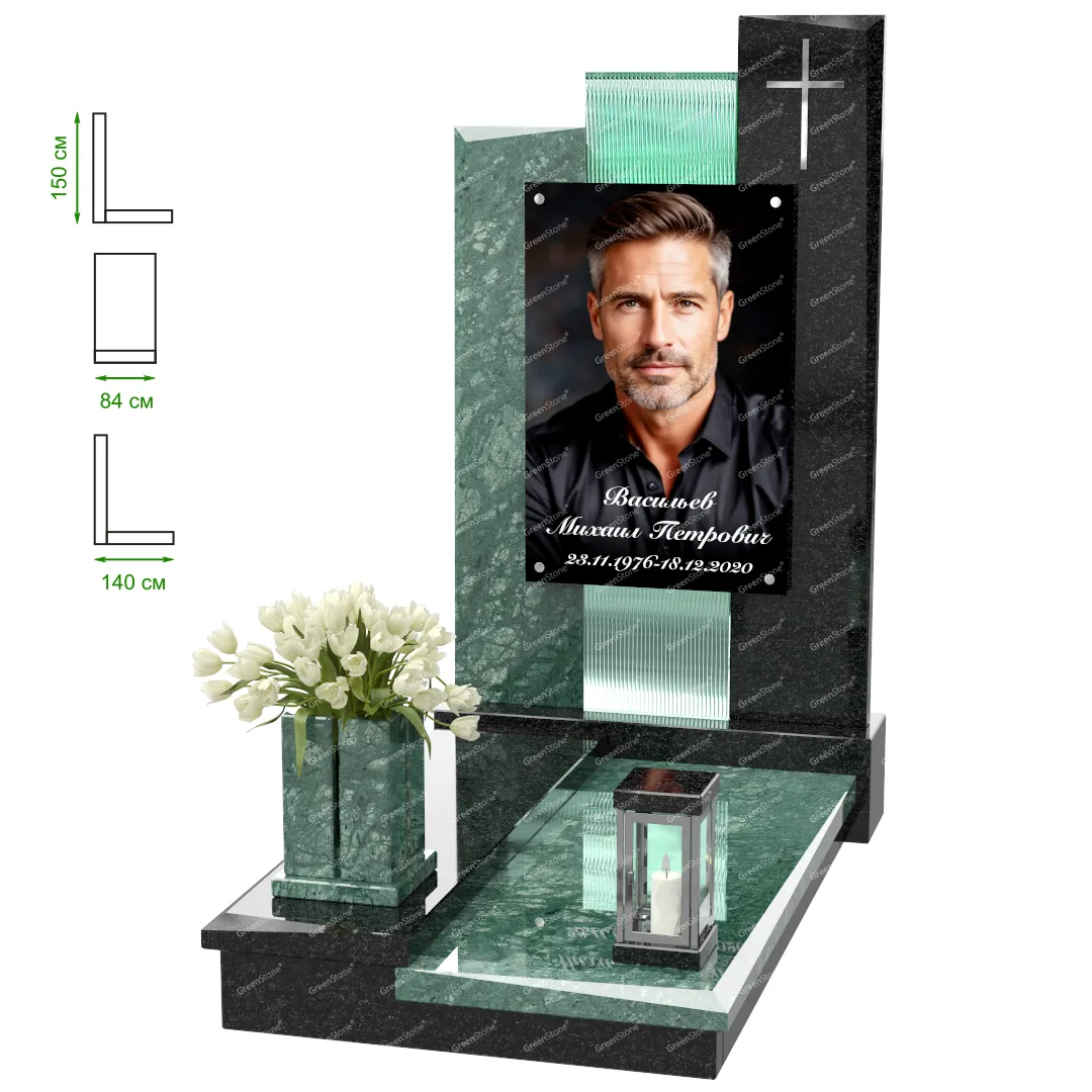 Визуально комплекс отличается от типовой формы не только формой, но и размерами. Массивная стела позволяет дизайнеру реализовать практически любые задумки и пожелания Заказчика, придать готовому изделию солидный вид, раскрыть все достоинства использованного в его изготовлении гранита. Такой габаритный памятник требует профессиональной доставки и установки. Все это также можно заказать в мастерской Грин-Стоун.
