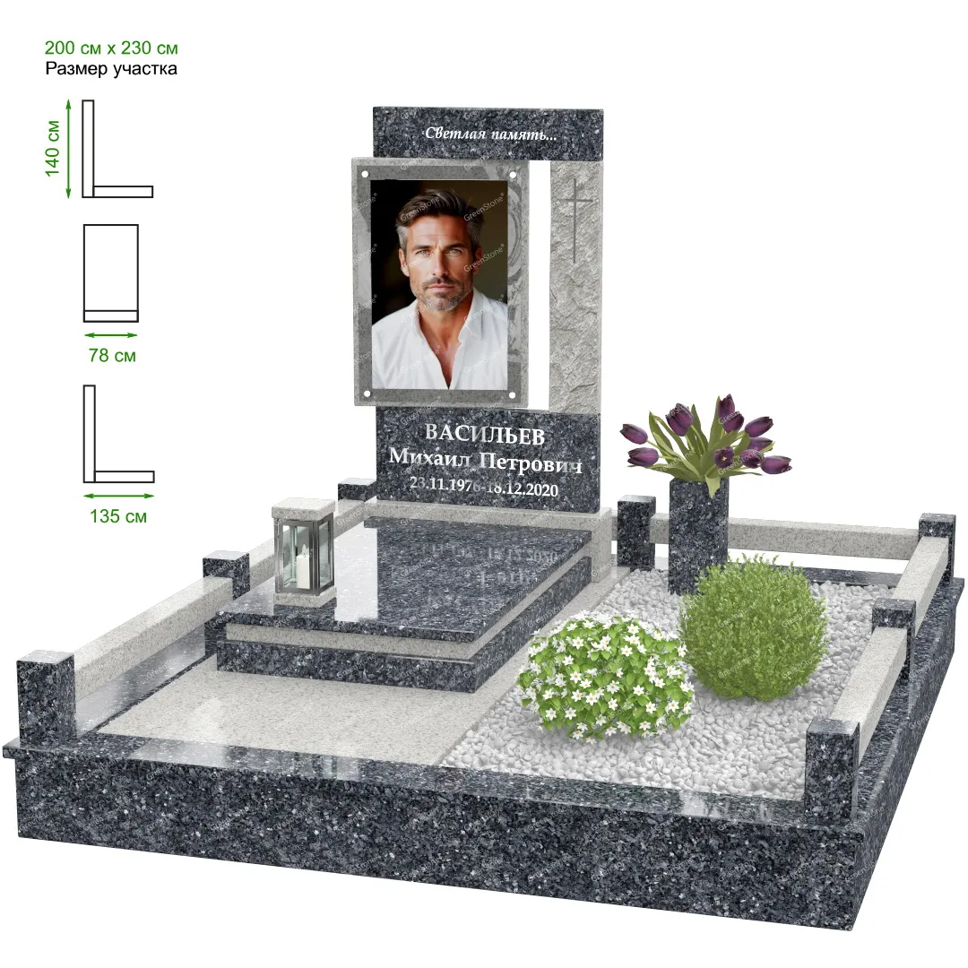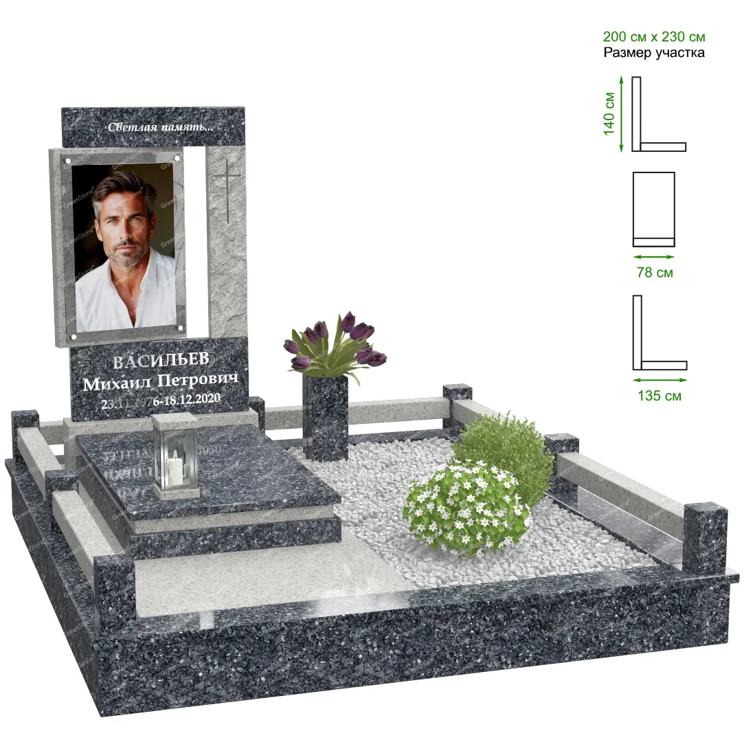Визуально комплекс отличается от типовой формы не только формой, но и размерами. Массивная стела позволяет дизайнеру реализовать практически любые задумки и пожелания Заказчика, придать готовому изделию солидный вид, раскрыть все достоинства использованного в его изготовлении гранита. Такой габаритный памятник требует профессиональной доставки и установки. Все это также можно заказать в мастерской Грин-Стоун.