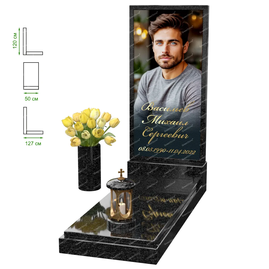 Визуально комплекс отличается от типовой формы не только формой, но и размерами. Массивная стела позволяет дизайнеру реализовать практически любые задумки и пожелания Заказчика, придать готовому изделию солидный вид, раскрыть все достоинства использованного в его изготовлении гранита. Такой габаритный памятник требует профессиональной доставки и установки. Все это также можно заказать в мастерской Грин-Стоун.