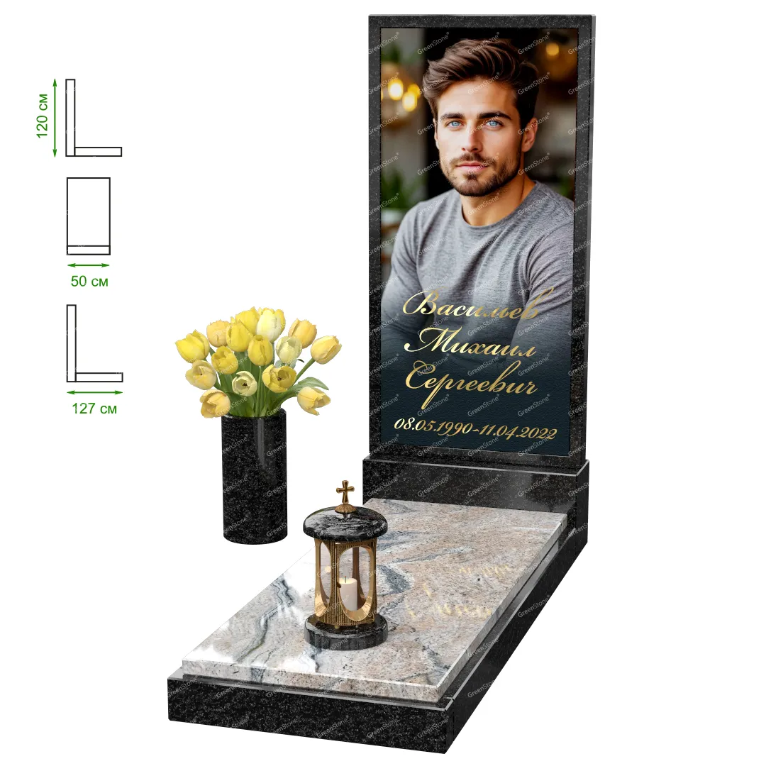 Визуально комплекс отличается от типовой формы не только формой, но и размерами. Массивная стела позволяет дизайнеру реализовать практически любые задумки и пожелания Заказчика, придать готовому изделию солидный вид, раскрыть все достоинства использованного в его изготовлении гранита. Такой габаритный памятник требует профессиональной доставки и установки. Все это также можно заказать в мастерской Грин-Стоун.