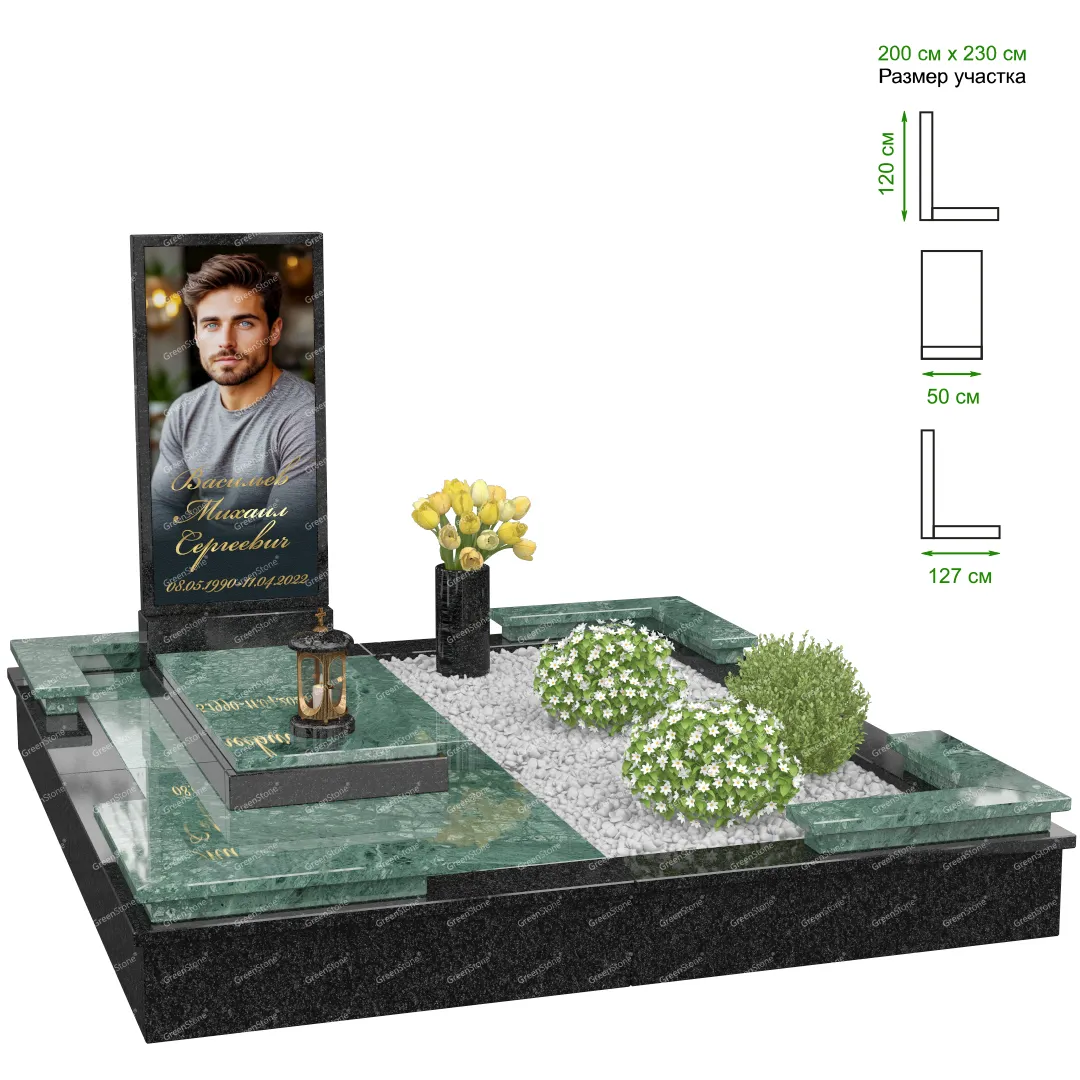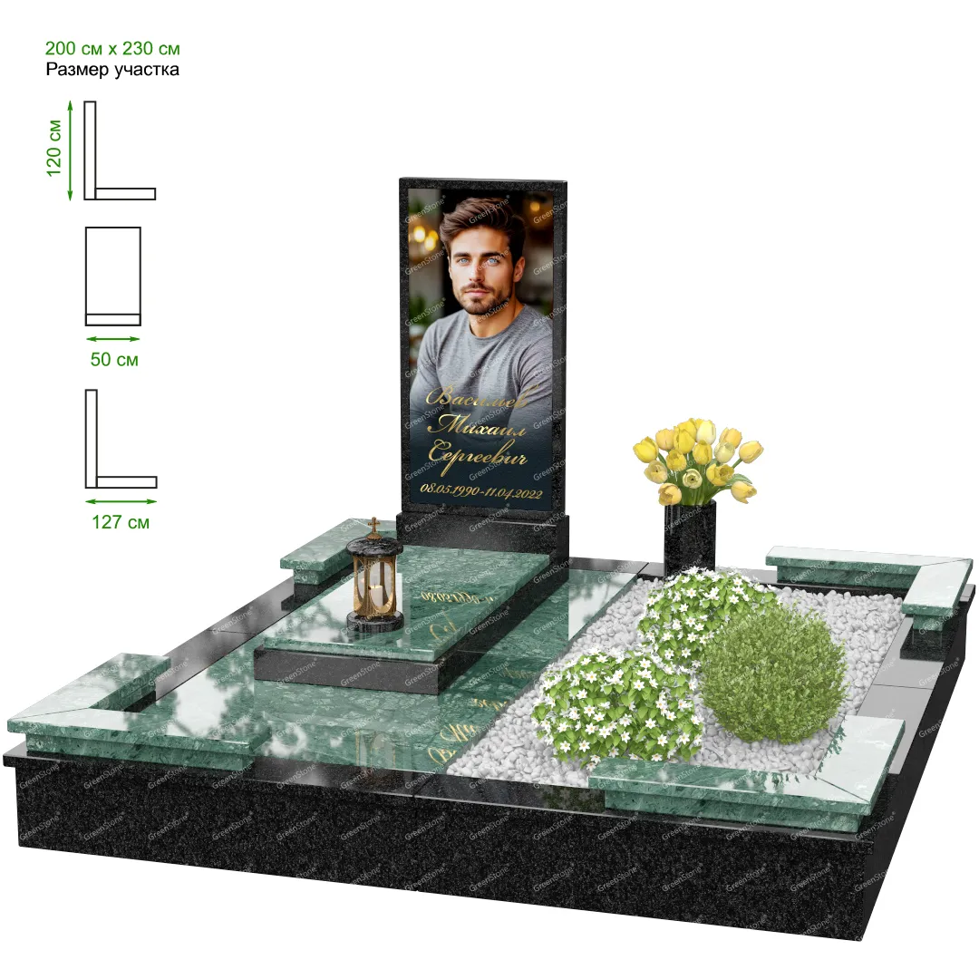 Визуально комплекс отличается от типовой формы не только формой, но и размерами. Массивная стела позволяет дизайнеру реализовать практически любые задумки и пожелания Заказчика, придать готовому изделию солидный вид, раскрыть все достоинства использованного в его изготовлении гранита. Такой габаритный памятник требует профессиональной доставки и установки. Все это также можно заказать в мастерской Грин-Стоун.